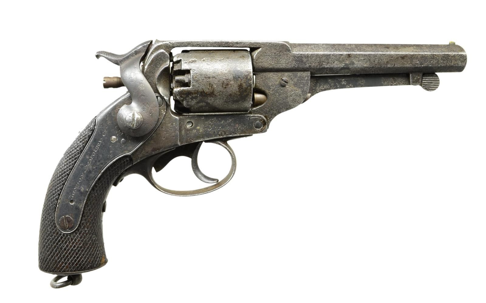 Cal. 54 bore. S# 7041. Kerr revolvers made by London Armoury Co. produced about 9,000 revolvers for the Confederacy. They fall in serial range of about 1000 to 10000 and many have Confederate inspection marking stamped in buttstock "JS/Anchor" such as this example. CONDITION: fair-good, pitted cleaned metal, appears all original with exception of restored cylinder pin and few screws, mechanics need attention-cocks and indexes sporadically. (01-21531/JS). ANTIQUE. $2,000-3,000.