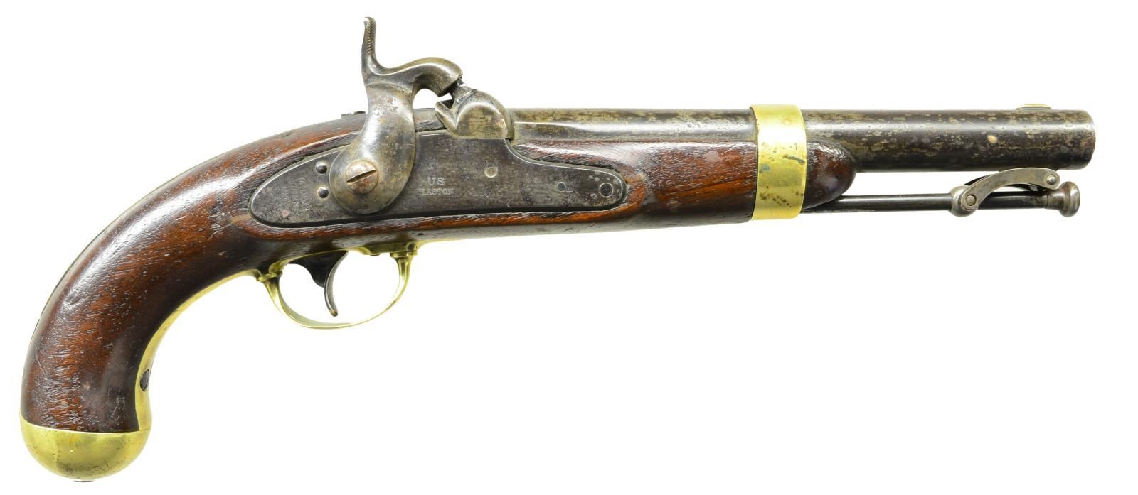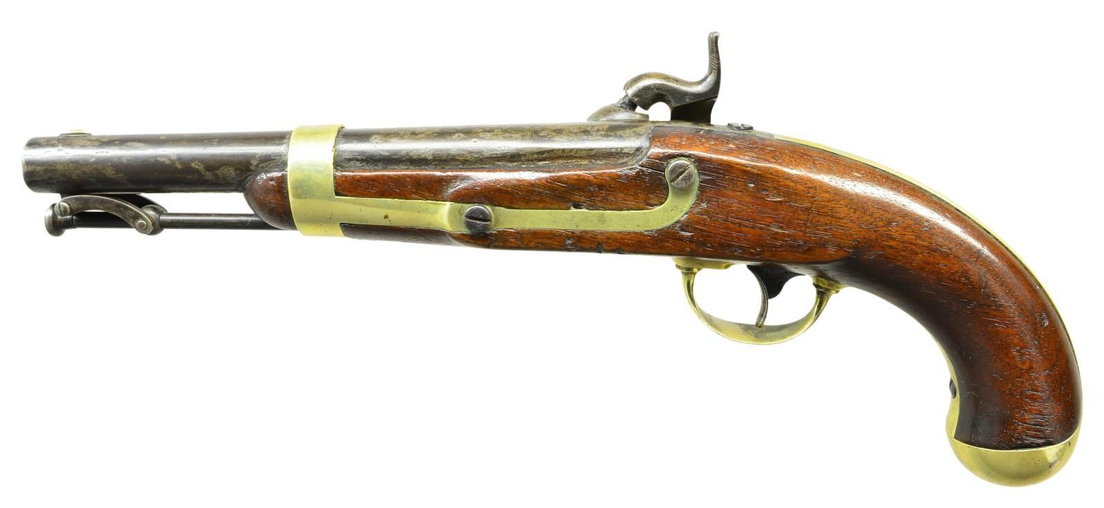 SINGLE SHOT PISTOL. Cal. .54. NSN. CONDITION: good overall, ramrod restored, otherwise original & complete, strong mechanics, smooth rusted bore. (01-21471/JS). ANTIQUE. $600-800.