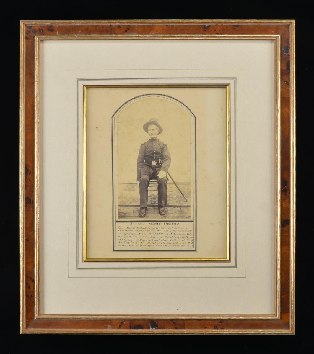 VICKERS. 5” x 8” albumen plus text and frame 17” x 20”. Thomas Vickers (1788-1866) had illustrious and longest military career imaginable. Born in England joined Coldstream Guards in 1806 with service till 1827 when was discharged, he came to NYC in 1829, joined the US Army in 1831, in 1836 he was assigned to Washington Arsenal where he stayed until day of his death November 1, 1866. He is seated wearing Hardee hat, sword, 9 button frock with sergeant chevrons and 7 service stripes, and ordnance insignia on collars, Vickers was awarded this rank in 1862. This image was displayed at office of late Michael MacAfee, Curator of History, West Point Museum. CONDITION: very good as framed, light foxing and yellowing. (02-17021/JS). $600-800.
