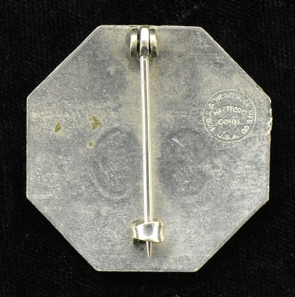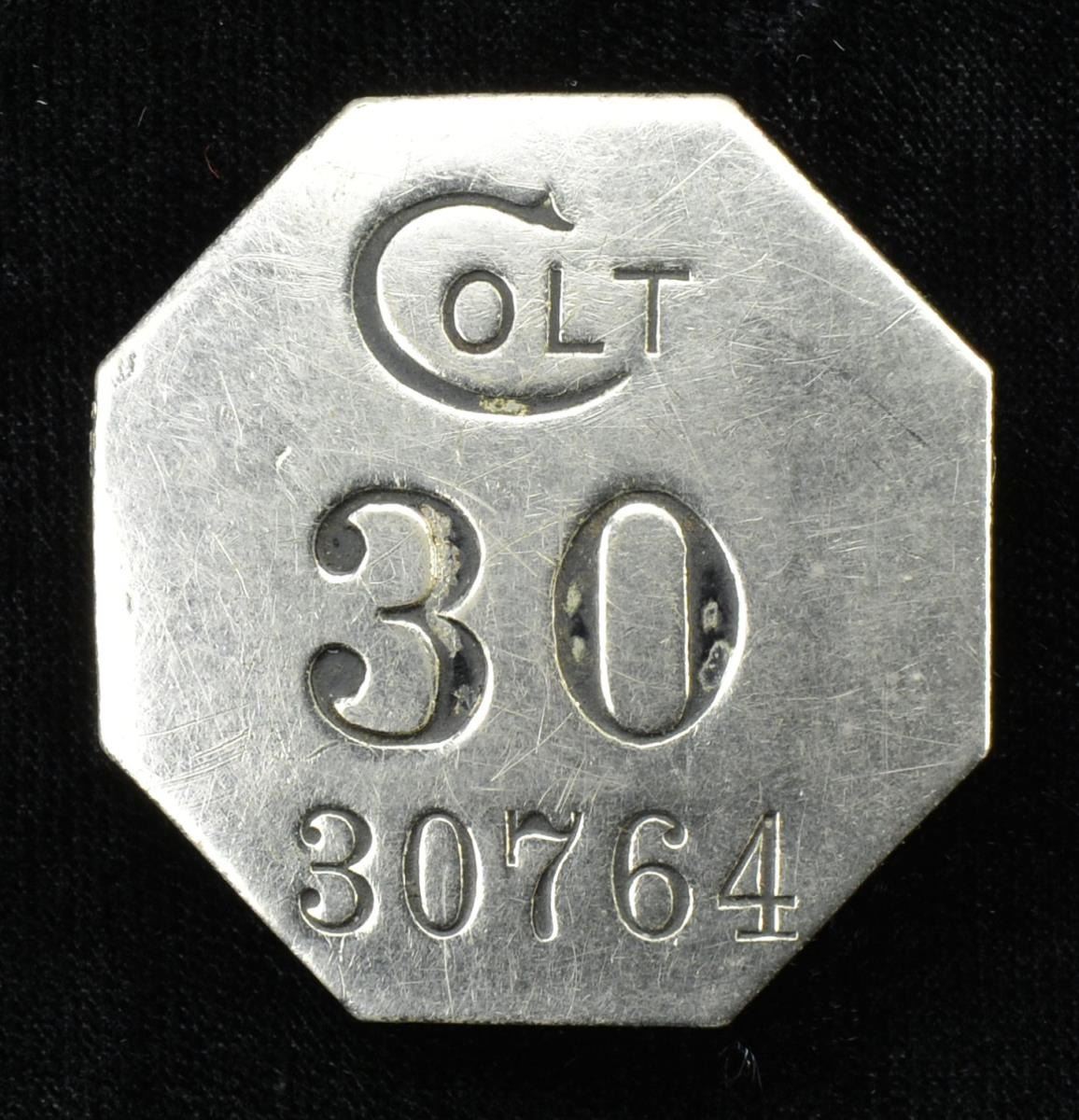 A very nice example of a scarce, original Colt Factory employee badge. The face of the nickeled, octagon badge reads, “COLT / 30 / 30764” in depressed, blackened characters. The reverse has the original pin intact & is marked, “NOBLE & WESTBROOK MFG. CO. U.S.A. HARTFORD CONN.” in a circle. CONDITION: badge shows light overall wear w/ some minor losses to blackened characters. (02-16753-2/BF). $200-300.
