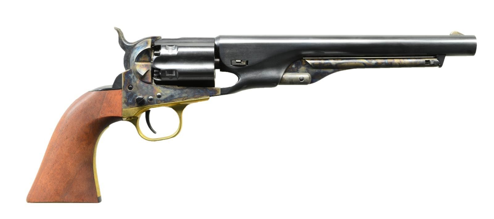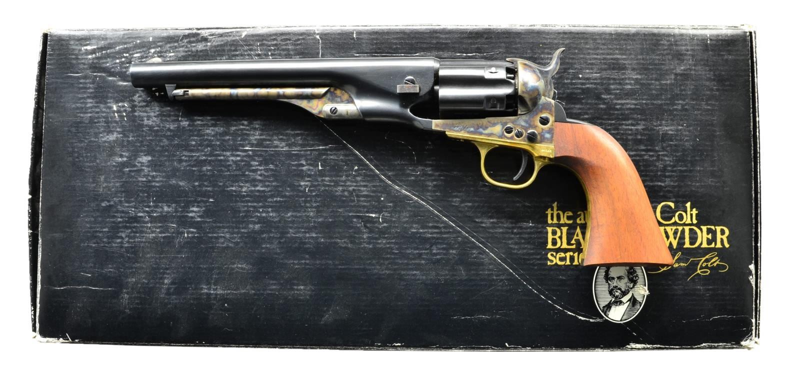Cal. 44. S# 209259. Bbl. 7 1/2" rnd. Blade front sight. 6 Rnd. cyl w/ September 10th 1850 patent date. Case colored frame, hammer & loading lever. Brass backstrap & trigger guard. Walnut grips. UNATTACHED ACCESSORIES: black cardboard box end labeled to gun w/ foam lining & paperwork. CONDITON: near excellent grips. Metal retains 95% original blue & case colors. Brass parts show light tarnishing. Very good bore. (01-21108/MJC). ANTIQUE. $500-700.