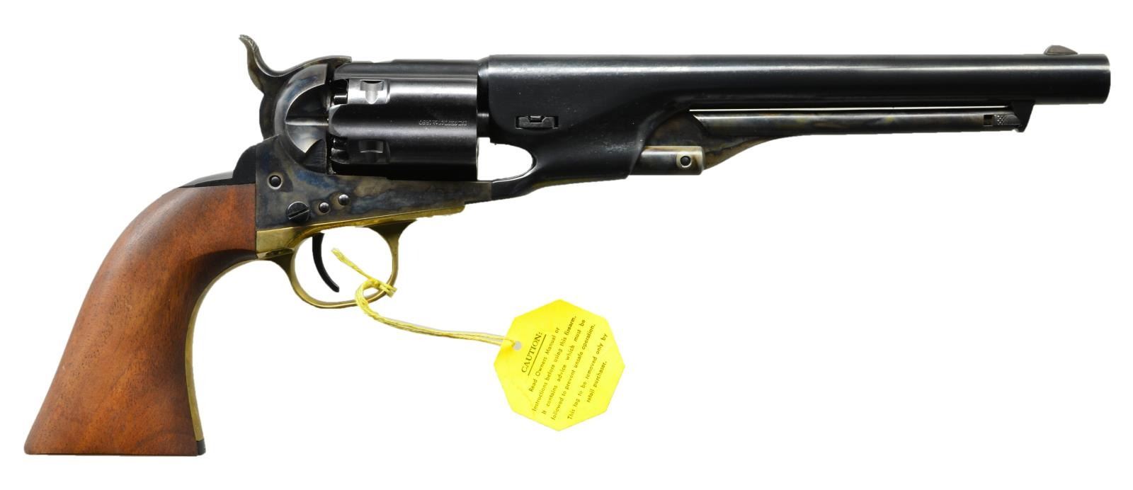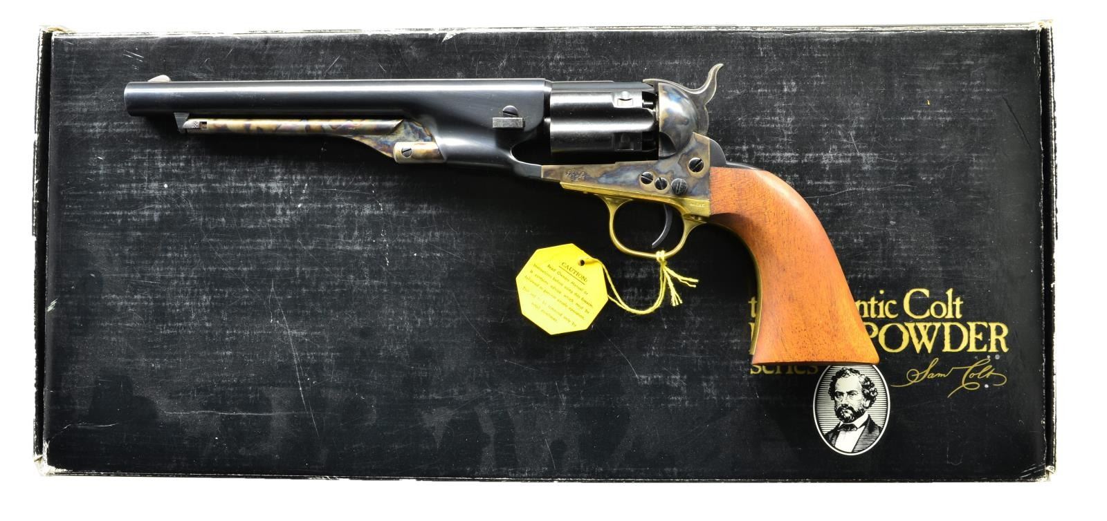 Cal. 44. S# 208016. Bbl. 7 1/2" rnd. Blade front sight. Fluted 6 rnd. cyl. w/ Sept. 10th 1850 patent date. Case colored frame, loading lever and hammer. Brass backstrap & trigger guard. Colt tag present on trigger guard. Walnut grips. UNATTACHED ACCESSORIES: black box w/ paperwork, foam lining & end labeled to gun. CONDITION: grips are near excellent. Metal retains 95% original blue. Brass areas show light tarnishing. Very good bore. (01-21107/MJC). ANTIQUE. $700-1000.
