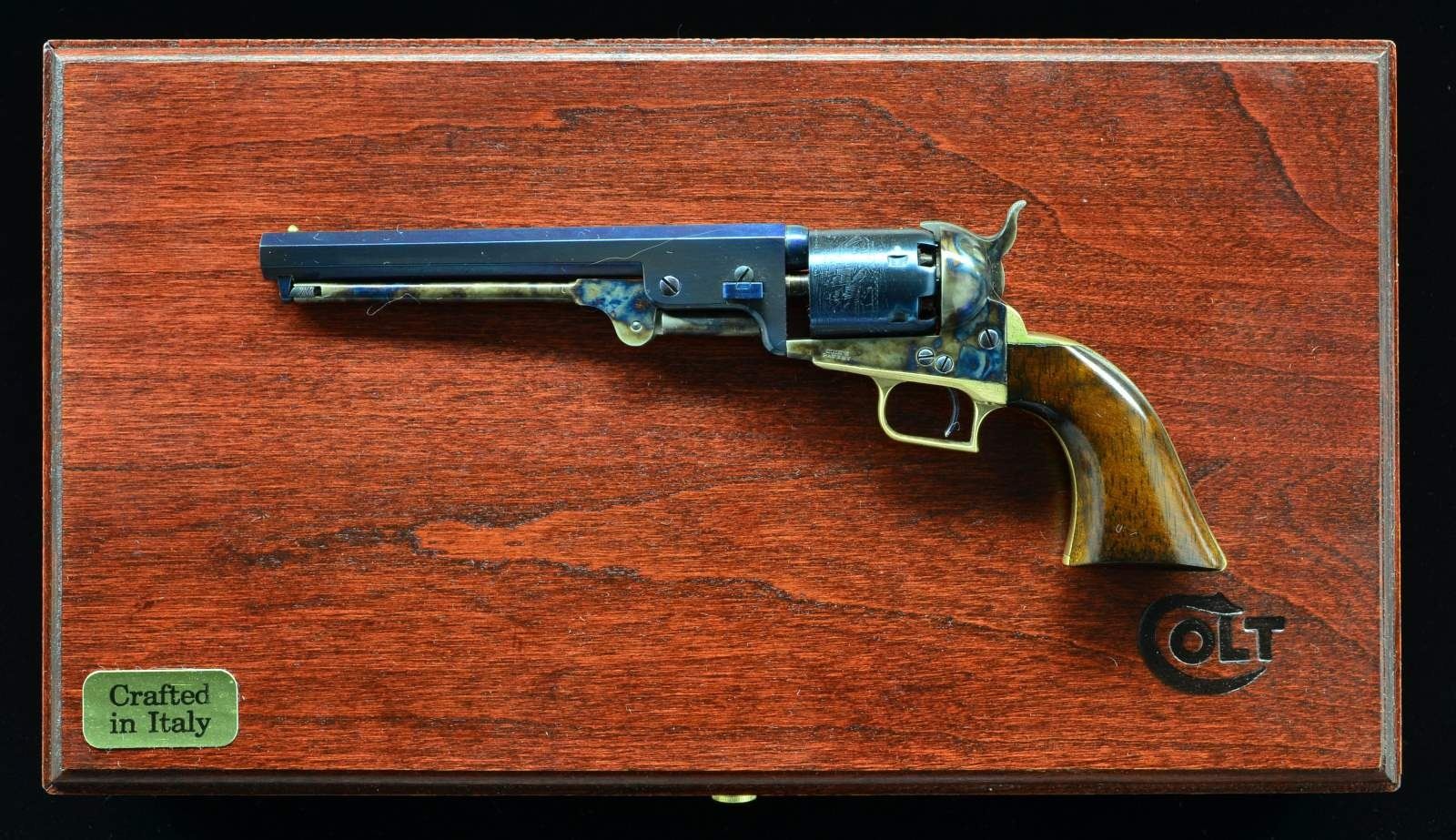 MINIATURE CLASSIC EDITION. S# 333. Sm. scale replica of Colt 1851 Navy revolver w/ matching numbers throughout. UNATTACHED ACCESSORIES: walnut felt shadow line case w/ US Historical Society plaque & sticker on lid "Crafted / in Italy" w/ Colt logo on lid. Case has box. CONDITION: near excellent. (02-17201/MD). $300-500.