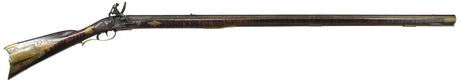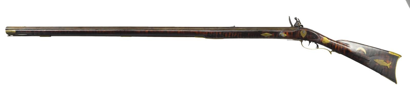 Cal. .36. NSN. 55” overall, 40” octagonal barrel with indiscernible markings, fixed front and rear sights, brass furniture, 7 inlays including silver “man-in-the-moon”, fish, hearts, engraved 4-piece patchbox, light incised carved striped maple full length stock