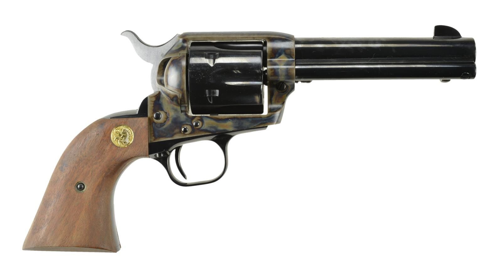 Cal. 44-40. S# S02353A. Bbl. 4 3/4" w/ blade front sight & frame notched rear. Mfg. 1993 w/ case colored frame plus balance blued. Smooth walnut grips w gold Colt medallions. Very desirable Colt for Cowboy Action shooting or collecting. UNATTACHED ACCESSORIES: blue 2 piece box w/ packaging plus outer sleeve. CONDITION: all aspects near excellent appearing new & unfired. (22-3526/NW). MODERN. $1,000-1,500.
