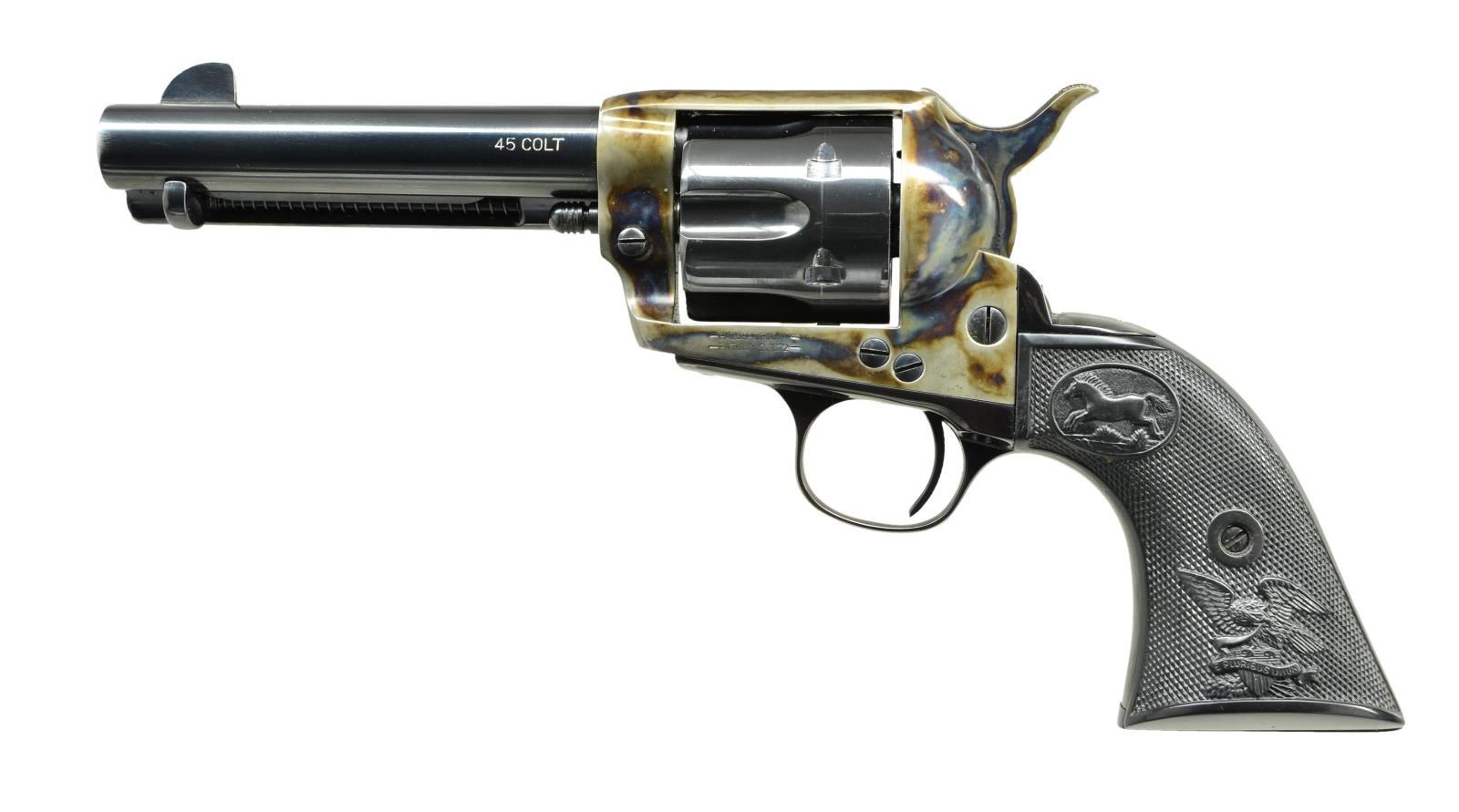 Cal. 45 Colt. S# P019. Bbl. 4 3/4" w blade sight plus fame notched rear. Components mfg. by ASM in Italy & assembled in Florida. 19th AWA Peacemaker produced! Appears to be Colt other than bbl. markings; Colt style checkered black plastic grips having standing horse & eagle logos. Colt patent dates on case colored frame; cased hammer w/ cone shaped firing pin. Matching numbers on trigger guard, backstrap & cyl. CONDITION: just a hint of thinning at beginning of cyl. stop leads & at muzzle; all other aspects near excellent including bore & grips. (22-3523/NW). MODERN. $700-1,000.