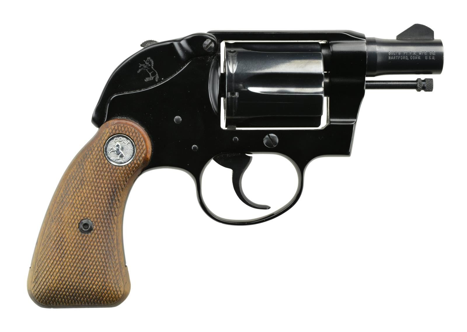 Cal. 38 Spl. S# 265370LW. Bbl. 2" w/ serrated blade. Mfg. 1968 (1950-1972) as first issue (exposed ejector rod) having later shorter gripped alloy frame w/ raised panel checkered walnut grips extending below frame plus silver medallions. Rare Colt black anodized hammer shroud leaving tip of spur available. CONDITION: very slight mark around lower rear shroud screw likely from improper screwdriver use; all other aspects near excellent w/ unfired appearance. Very slight thinning on top of front sight & outer most edges of bbl. at muzzle. (22-2658/NW). CURIO. $1,000-1,500.