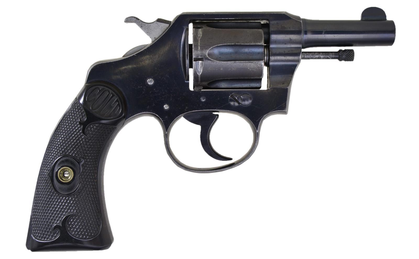 Cal 32 Police. S# 210169. Bbl. 2 1/2". Frame mfg. 1925. Bbl. has 1926 patent date. Blade front sight. Bbl. marked "B.32" on the left side. There is debate about what the "B" marking means. Some think these guns were 2nd quality & sold to Latin American countries. These Latin American guns are called "Pequeno" or "Little One" in Spanish. It is worth noting that the official serial range for these "Pequeno" guns began at 226,000. Checkered Colt grips that are scratch numbered "106882" on the inside. CONDITION: left grip panel has a 1/2" chip at bottom rear, grips otherwise show some dings, scratches & handling marks. Metal retains 60% blue finish w/ a some cleaned areas on cyl., scattered thinning to gray, scratches, & light oxidation. Very good plus bore. (22-4313/MJC). CURIO. $300-500.