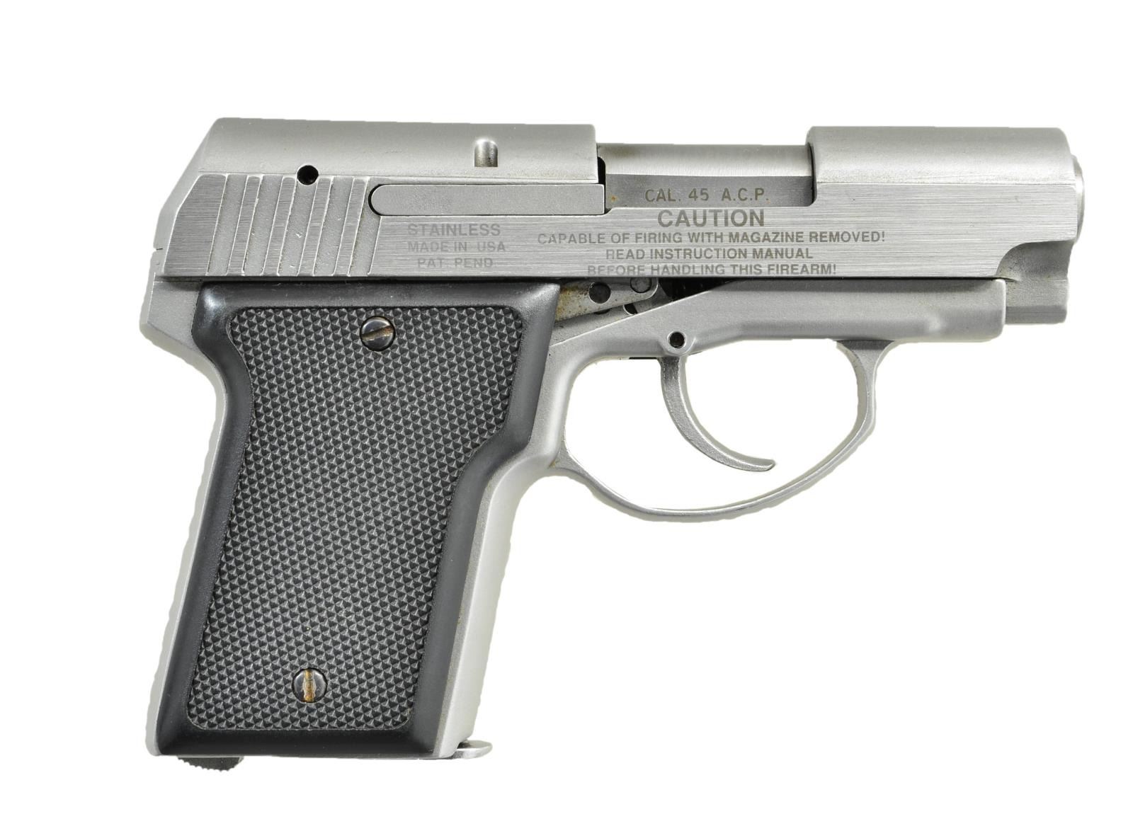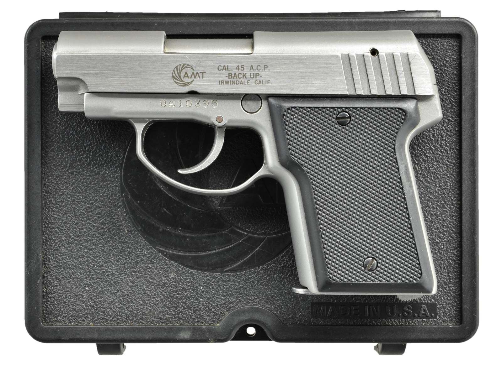 Cal. 45 ACP. Ser. #DA10395 . Bbl. 3". DAO. Sighting groove in top of slide. Stainless steel pistol is designed to fire double action only. Markings on left side of slide include AMT logo. "CAL.45" "A.C.P." "BACK UP" 'IRWINDALE, CALIF." Markings on right side of slide include safety warnings. Bbl. marked "CAL.45" "A.C.P." Checkered black plastic grips. MAGS: 1 5 rd. "A.M.T". marked. UNATTACHED ACCESSORIES: black plastic storage box. CONDITION: pistol in very good to near excellent overall condition. Good shiny bore. (22-4342/RW) MODERN. $400-600.