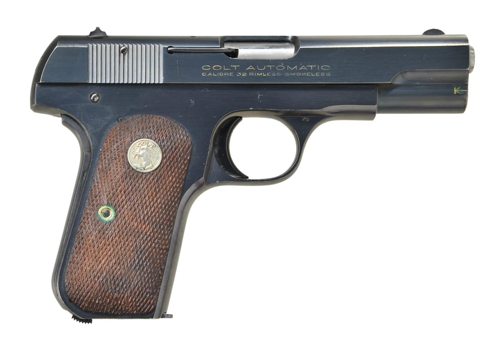 Cal. 32 ACP. S #514863. Bbl. 3 3/4". Semi circular front sight. Fixed U-notch rear sight. Blued finish. Markings have added yellow paint. Checkered walnut grips w/ rampant Colt medallion. 1934 mfg. date. MAGS: 1 detachable rd. marked "CAL. 32" & "COLT". CONDITION: grips: show older added finish w/ some scattered handling wear. Metal retains 93% original blue w/ some light high edge wear & scattered handling marks. Very good bore w/ some light frosting. (22-3592/MJC). CURIO. $500-700.