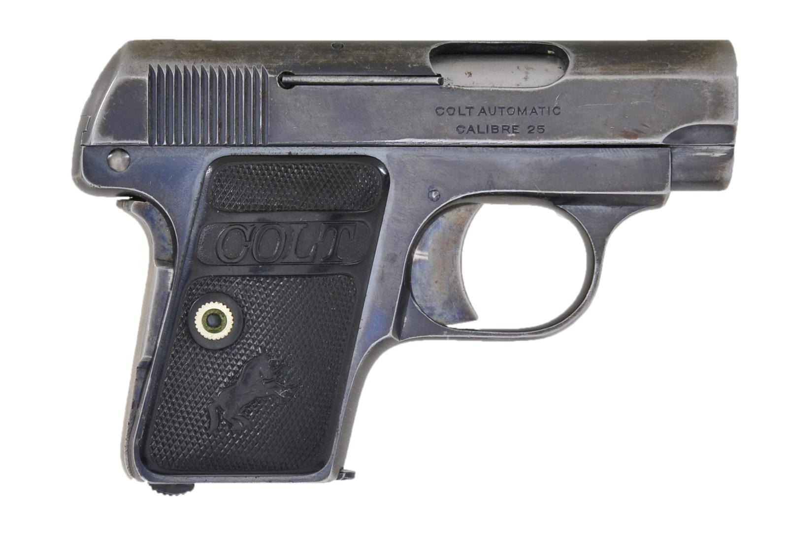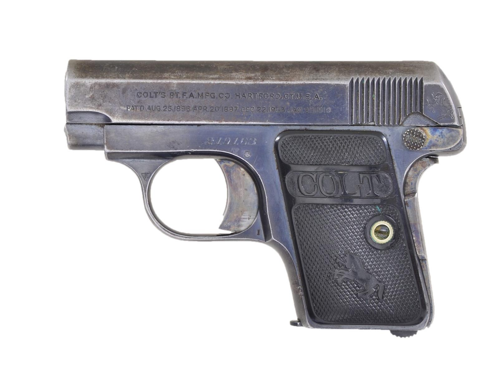 Cal. 25 ACP. S 219163. Bbl. 2". Mfg. 1919. Blue finish w/ case colored hammer & safety. Checkered rubber grips w/ Rampant Colt. MAGS: 1-6 rd. CONDITION: grips show moderate handling wear. Metal retains 50% original blue w/ scattered thinning to gray & some light oxidation. Worn pitted bore. (22-3160/MJC). CURIO. $300-400.