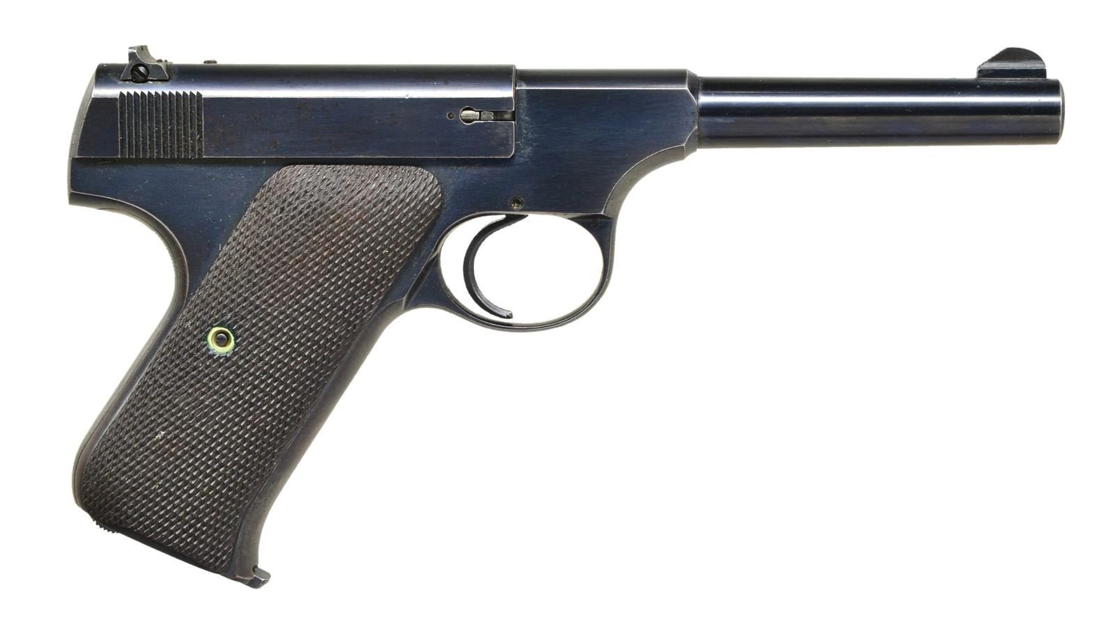 Cal. 22 LR. S# 121605. Bbl. 4 1/2". Serrated ramp front sight. Square notch rear sight. Blue finish. Checkered walnut grips. Mfg. 1937. Serial number has white highlight. MAGS: 1 detachable 10 rd. CONDITION: grips show a few a couple flattened areas & wear from the years. Metal retains 85% original blue w/ most loss along front & back strap. Very good bore. (22-3591/MJC). CURIO. $600-900.