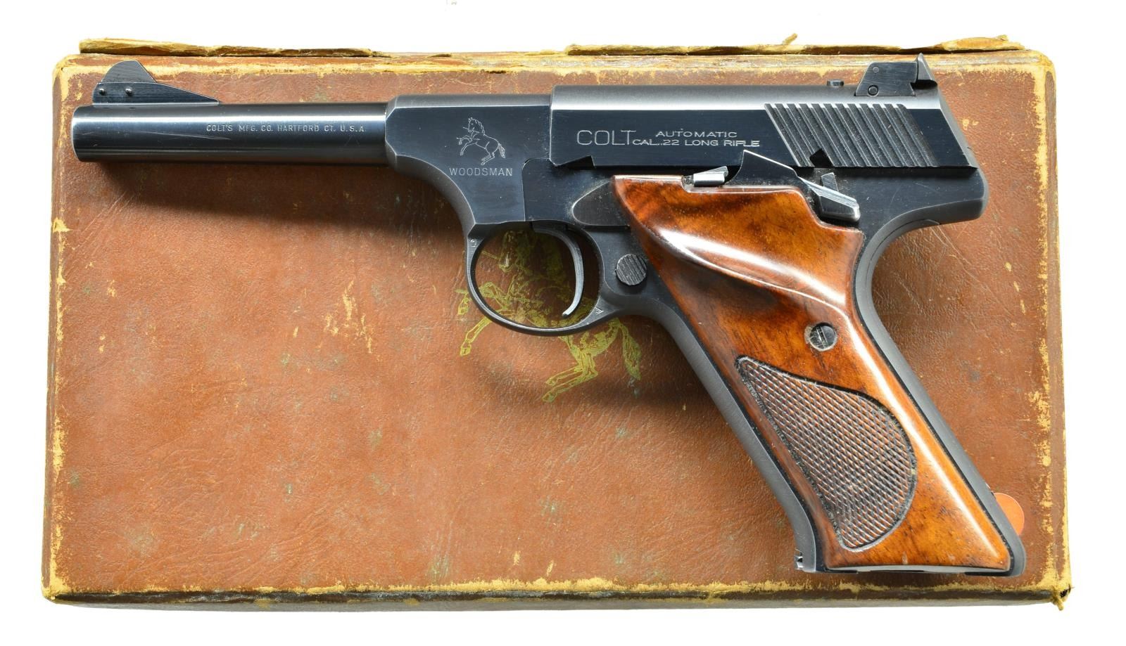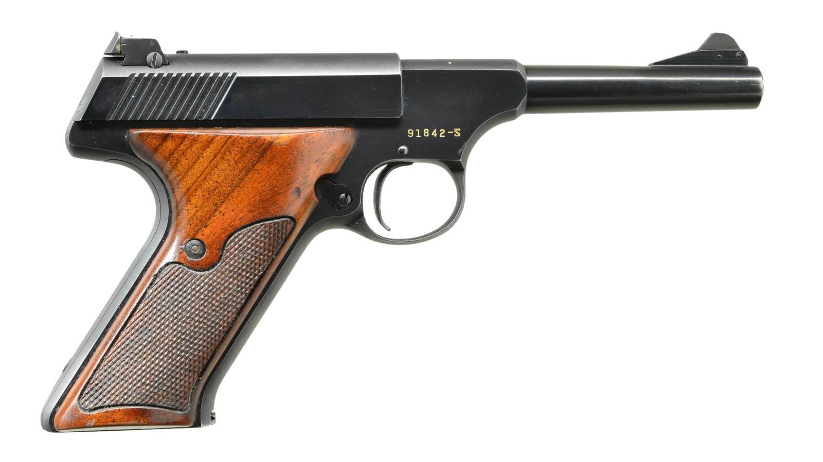 Cal. 22 LR. S# 91842-S. Bbl. 4 1/2". Second series pistol w/ right side mag. release. Ramped serrated blade front sight. Colt Master adj. rear sight. Checkered brown grips w/ RH thumbrest. MAGS: 1 factory 10 rd. that shows scratches on baseplate. UNATTACHED ACCESSORIES: brown factory box w/ unnumbered Sport Model label. CONDITION: grips show light handling wear. Metal retains 90% original blue w/ some light high edge wear & thinning to gray on the straps. Very good bore. (22-3565/MJC). CURIO. $600-900.
