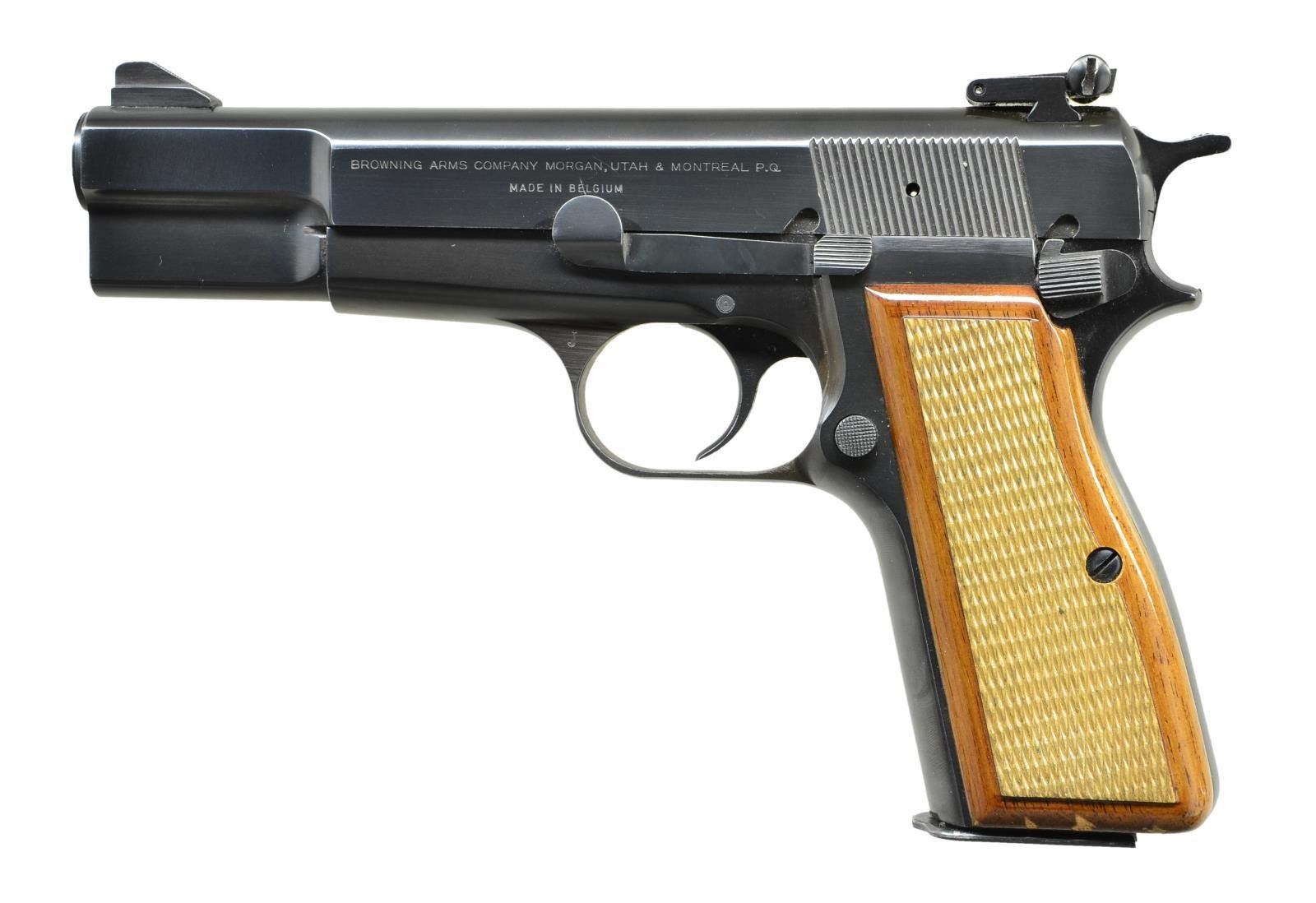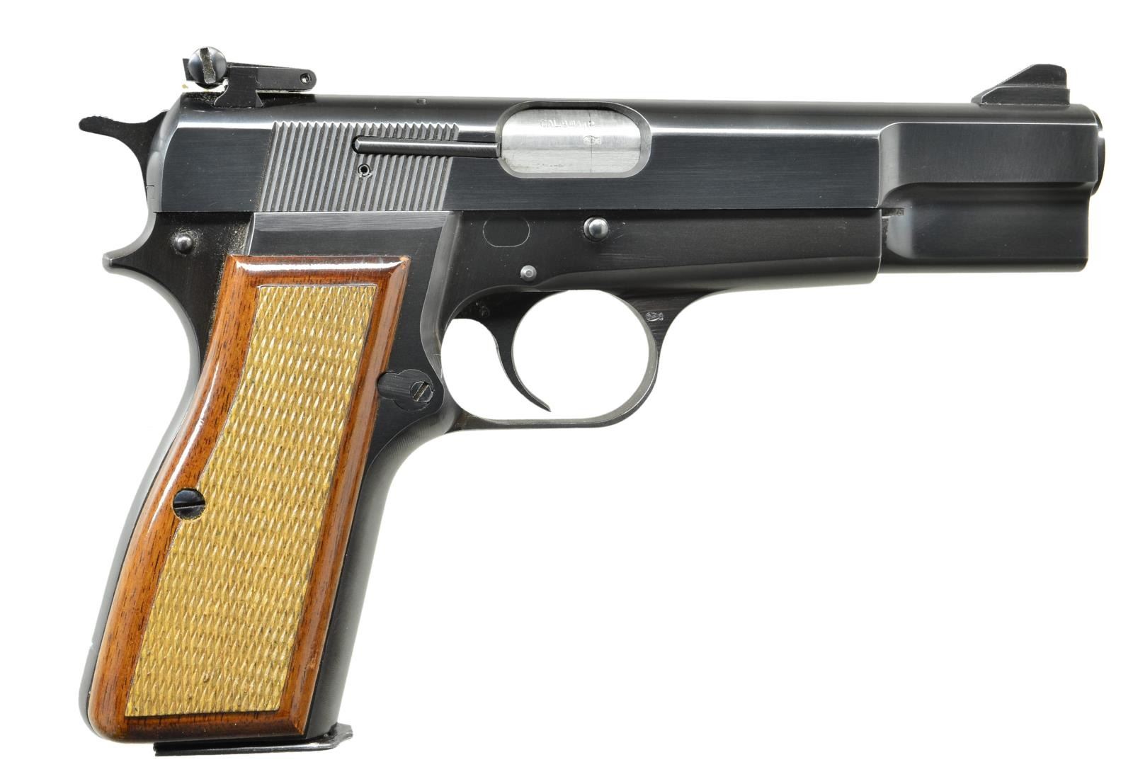 Cal. 9mm Luger. S# 73C94219. Bbl. 4 5/8". The Browning Hi Power has been manufactured, commemorating John M. Browning's last pistol design since 1935 in numerous configurations. This particular example is a post War 9mm Parabellum w/ visible extractor & spur hammer. Serrated slide w/ fixed blade front sight & target adjustable rear. Left side controls including safety, slide lock & serrated thumb actuated mag. release. Checkered hardwood grips. Mag: 1 steel 13 rd. mags. CONDITION: Blued finish on exposed metal surfaces enjoys complete coverage w/ no obvious sign of use. Right side grip panel is free from blemishing while left side has a few small chips on the bottom. Bright bore w/ strong rifling. Fire control mechanism appears to function correctly when cycled by hand. (22-3182/JZ). MODERN. $500-900.