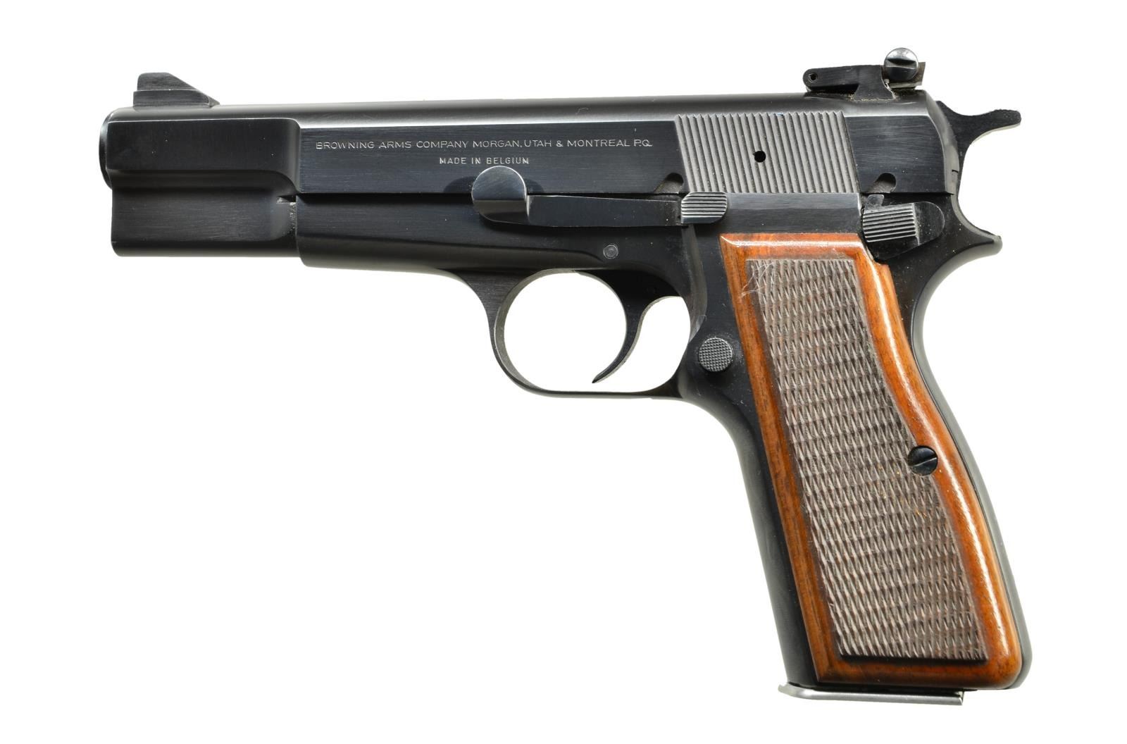 Cal. 9mm Para. S# 77C46207. Bbl. 4 5/8". Browning Arms marking on left side of slide. Serrated ramp front sight. Adj. rear sight. Polished blue finish. Checkered walnut grips. MAGS: 1-13 rd. nickel finish & unmarked. CONDITION: grips show light handling wear. Metal retains 98% original blue w/ a light rub mark on trigger guard. Near excellent bore. (22-4359/MJC). MODERN. $600-900.