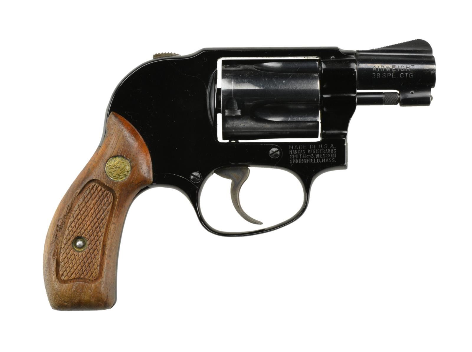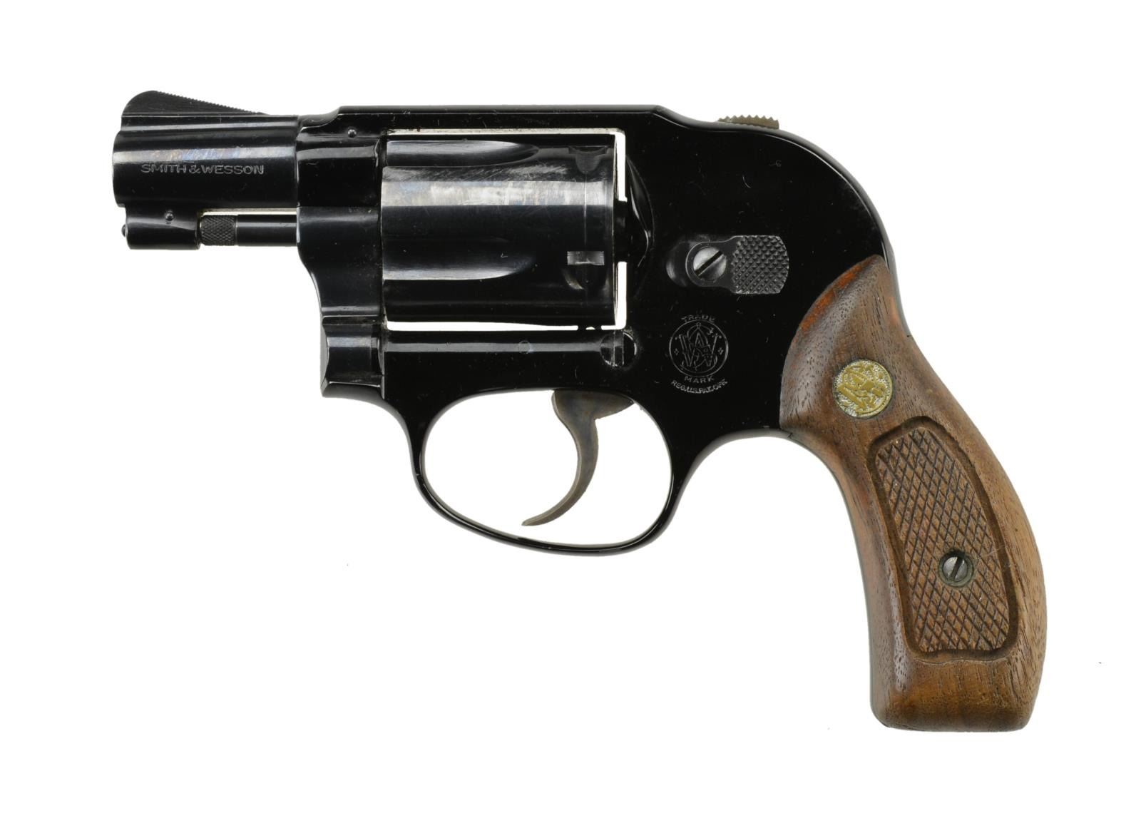Cal. 38 SPL. S# 31J574. Bbl. 2" Mfg. 1968-1969. Traditional double action revolver built on the shrouded hammer alloy "J" frame. Serrated hammer spur is still accessible for single action use though still shrouded for deep carry without typical snag issues. Fluted, 5-shot cylinder. Blued finish. Ramp front sight & grooved top strap for rear sight. Smooth backstrap and front strap. Thin, serrated trigger. Checkered cylinder release. Factory checkered hardwood grips w/ S&W medallion. CONDITION: Blued finish enjoys complete & consistent coverage w/ some light thinning at muzzle and a few spots on cylinder, as indicative of firearms that spend extended time holstered. Light drag line on cylinder. Grips illustrate finish wear and thinned checkering, also indicative of long-term holstering. Shiny bore w/ sharp rifling.(22-4325/JZ). CURIO. $350-550