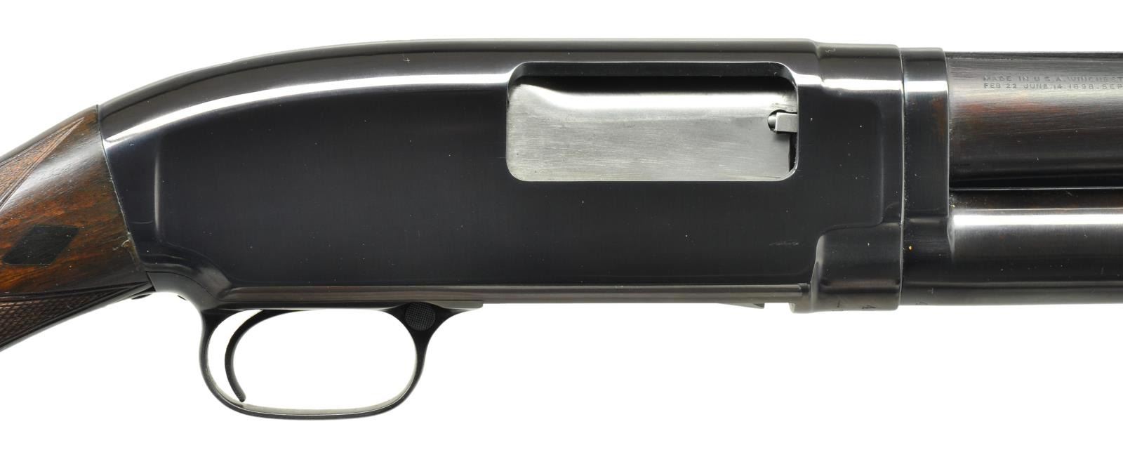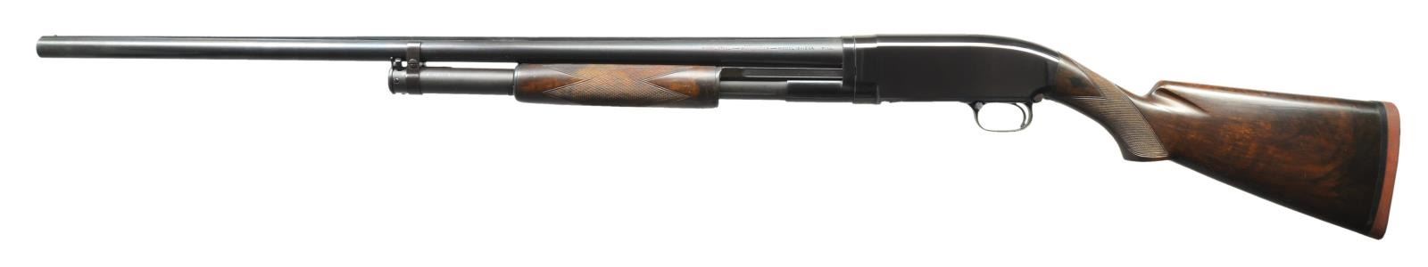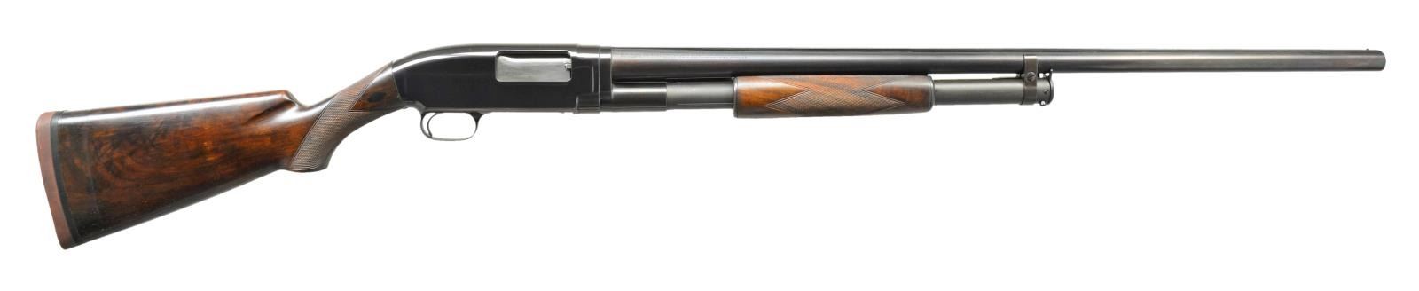 SHOTGUN. Cal. 12 Ga. S# 482648. Bbl. 30" Nickel Steel w/ solid rib & steel bead. Fixed full choke. Receiver is marked "TRAP" below S#. Sm. rnd. walnut forearm w/ trap grade wrap around checkering. Early style pistol grip stock of fancy walnut w/ checkering & Black Diamonds. LOP is 13 7/8" over a reproduction solid red pad & 1" wood spacer. Mfg. 1927. CONDITION: 98% reblued finish, bbl. has slight plum cast. Wood has good refinish w/ freshened checkering. Good mechanics. Good bright bore. (21-2236/DS). CURIO. $600-900.