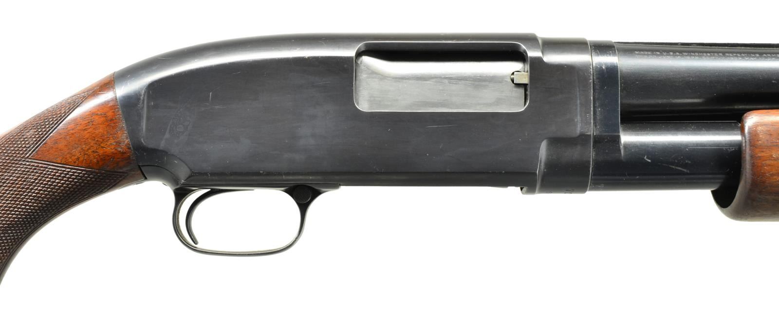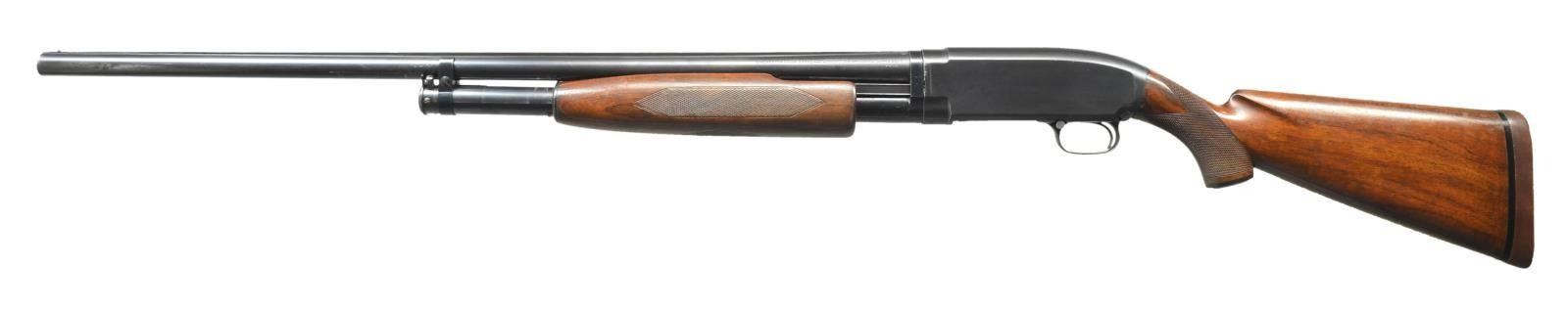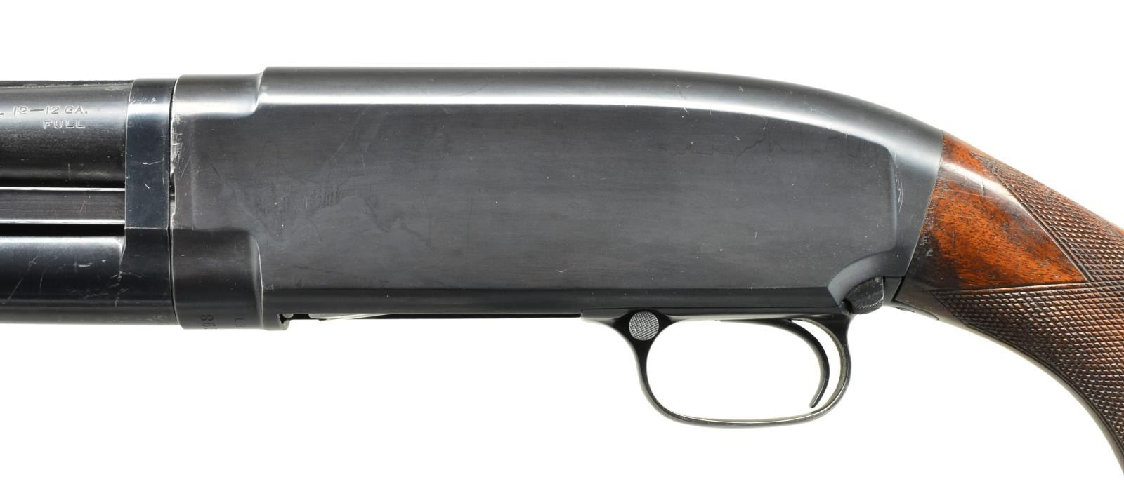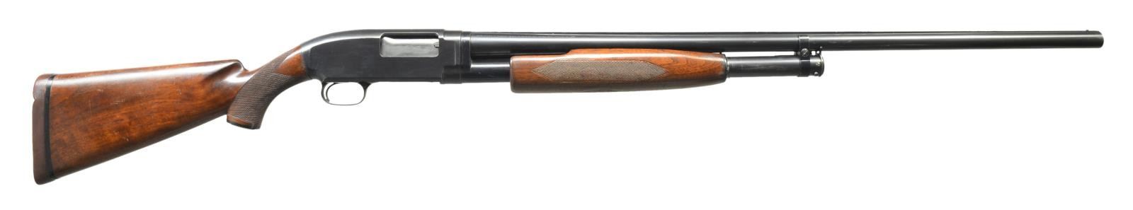 Cal. 12 Ga., 2 3/4". S# 709998. Bbl. 30" replacement of proof steel w/ solid rib & fixed Full choke. Steel front bead. Receiver is marked "SKEET" below S#. Factory checkered beavertail forearm. Stock is thinned & reshaped through wrist area w/ added plastic grip cap & hand checkering. Stock is shortened to LOP: 13 3/4" over an aftermarket No Shok solid red pad & 1/4" walnut spacer. 1936 Mfg. CONDITION: bbl. retains over 80% blue showing scratches & spots of light pitting. Action retains 90% dull reblued finish showing handling marks. Forearm has worn finish & checkering. Stock shows numerous scratches & marks. Bore is generally bright showing sm. spots of pitting w/ evidence of raised dents near muzzle. (21-2114/DS). ALL CURIO. $350-500.
