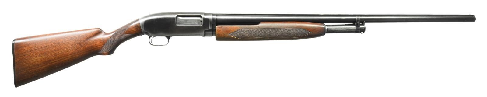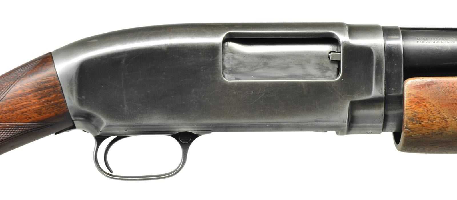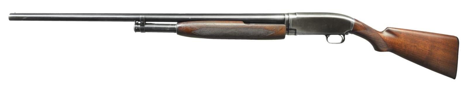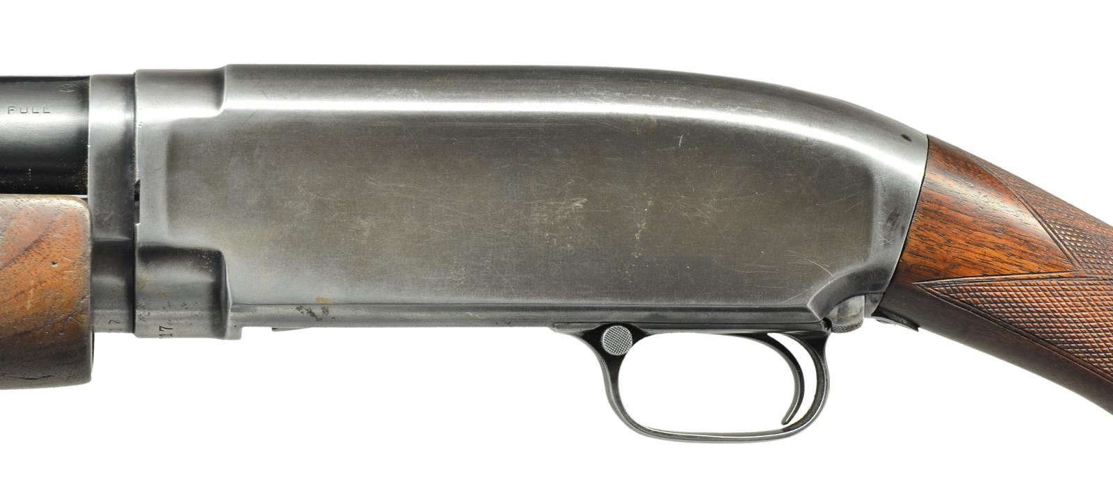 Cal. 12 Ga. S# 613717. Bbl. 30" of nickel steel w/ solid rib & steel bead. Fixed full choke. Extension beavertail forearm w/ factory checkering. Early style pistol grip stock w/ added tournament style checkering. LOP is 13 1/2" over a replacement buttplate. Mfg. 1930. CONDITION: 60% dull fading blue. Forearm has worn finish showing scratches & marks w/ a crack extending from rear of edge. Refinished stock has sm. chips around trigger guard tang. Good mechanics. Headspace ring has taken up 4 notches. Nice bright bore. (21-2366/DS). CURIO. $500-750.