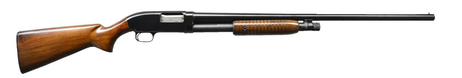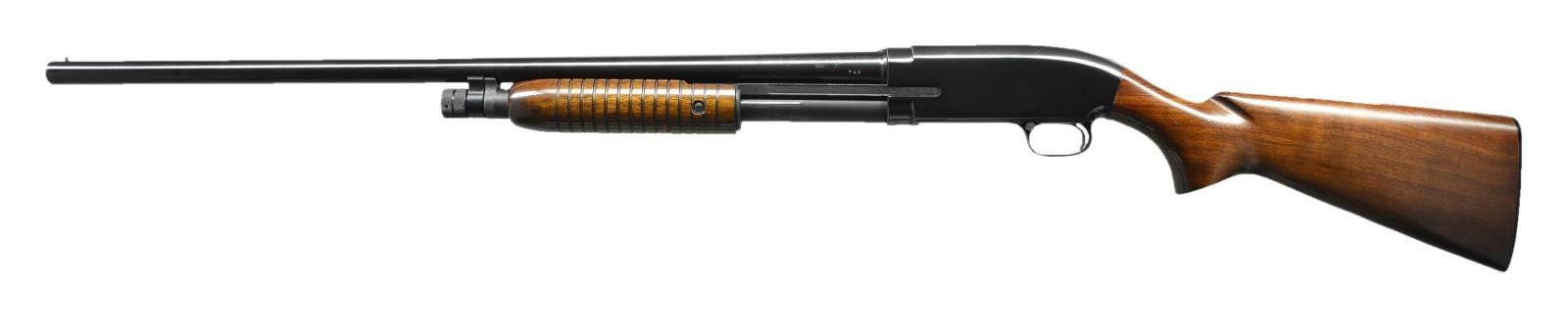 Cal. 12 Ga., 2 /34". S# 1823725F (1961). Bbl. 28" w/ bright bead & Mod choke. Grooved walnut forearm & pistol grip stock. CONDITION: very good overall wood & metal finish w/ handling & cycling wear. Very good bore. (22-2831/MD). CURIO. $400-550.