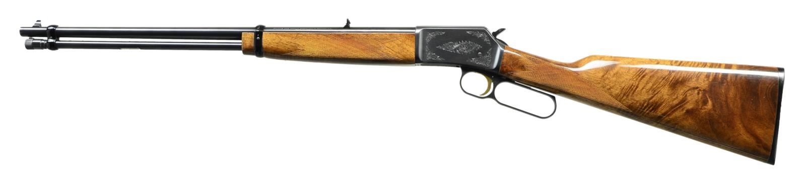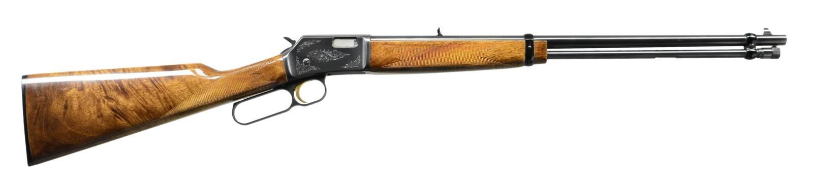 ACTION RIFLE. Cal. 22 S, L, LR. S# 47B40897. Bbl. 20" w/ bead front sight & folding leaf rear sight. Full length tubular mag. Blued action has Grade II aftermarket foliate scroll engraving. Gold finished trigger. Replacement gloss finished forearm & straight grip stock of fancy burl Walnut w/ added checkering & original buttplate. CONDITION: near excellent overall as when upgrade. Near excellent bore. (22-2790/MD). MODERN. $450-650.