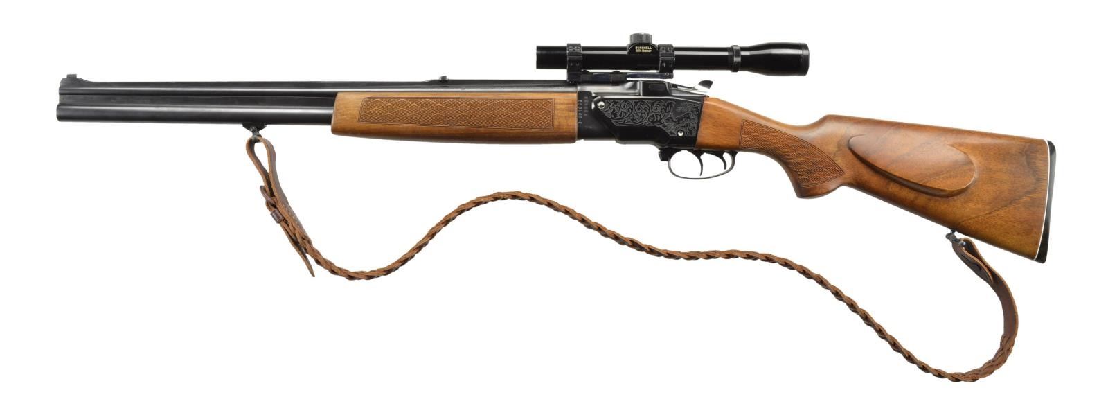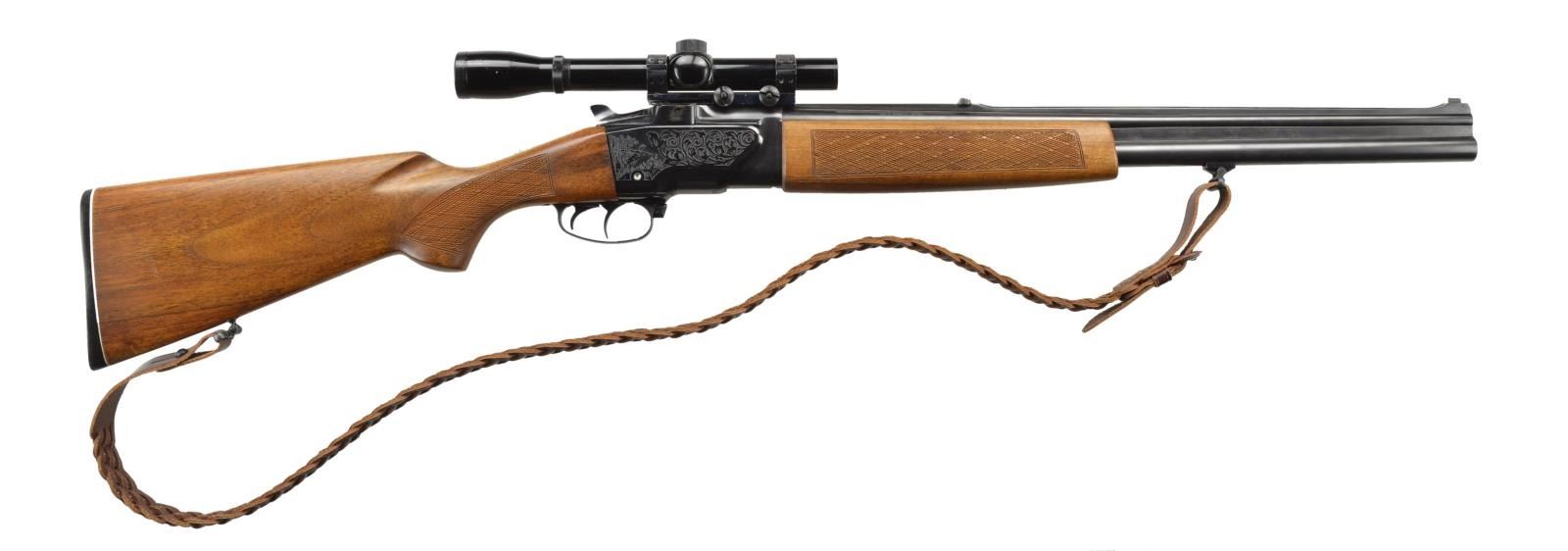 Cal. 22 Savage HP (5.6x52R) / 12 Ga., 2 3/4". S# 320439. Matching numbered 23 1/2" bbls. w/ rib having fixed sights & additionally numbered "3-901823". Bushnell Banner 2.5x20 scope w/ post & crosshair reticle on bbl. attached mt. Sides of receiver are engraved w/ woodlands scenes featuring pheasant on right side & doe on left accompanied by vine type foliate scroll. Action features dbl. triggers, automatic safety in trigger guard bow & extractors. Skip line checkered walnut forearm & pistol grip stock w/ cheekpiece & buttplate. Braided brown leather sling on swivels; bottom bbl. & toeline mounted. CONDITION: very good to near excellent overall appearance w/ light marks & fading of blue. Very good bores. (22-2449/MD). MODERN. $300-500.