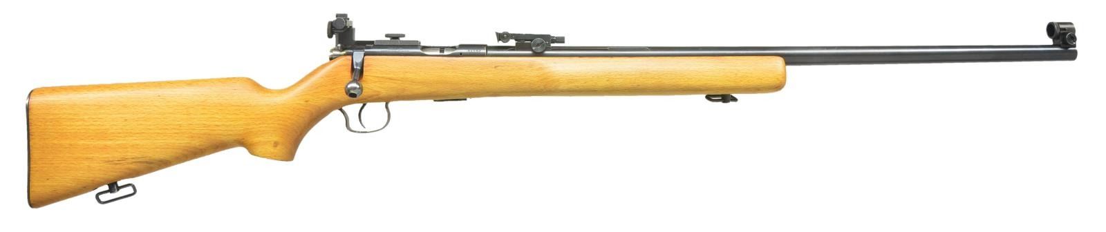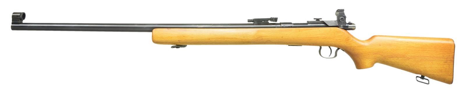 RIFLE. Cal. 22 LR. S# 31152 (1958). CAI import marked heavy 27 1/2" bbl. w/ globe post front sight, groove mounted BRNO Model 4 adj. rear sight & groove mounted BRNO Arms marked receiver sight. Target style hardwood pistol grip stock w/ forearm accessory having sling swivel, sling swivel on toeline & checkered buttplate. MAGS; 1 - 5 rd. CONDITION: very good blue w/ light fading of finish, spots of finish loss, & pinprick spots of pitting. Very good wood finish. Very good bore. (22-2598/MD). CURIO. $300-500.