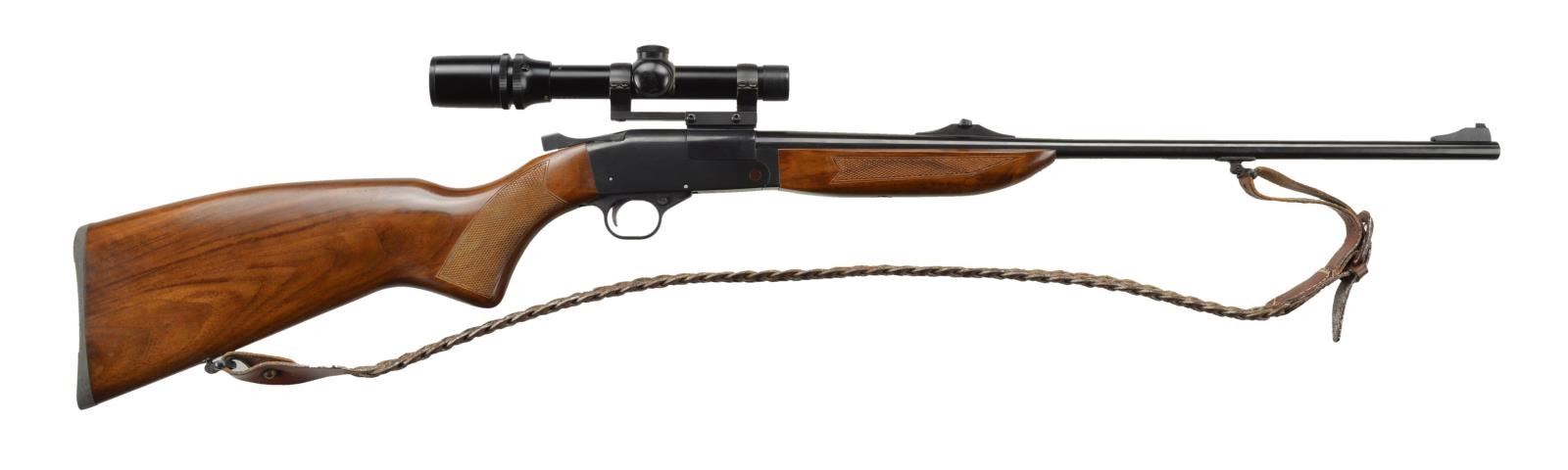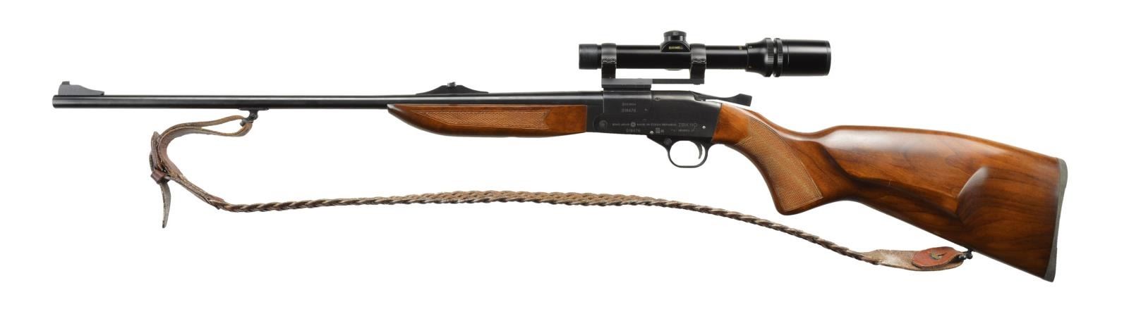Cal. 222 Rem. S# 018476 (1999). Bbl. 23 3/4" w/ ramp mounted fixed sights. Bushnell Scope Chief VI 1.5-4.5x20 scope w/ duplex reticle on BRNO Arms scope mt. Blue finish. CAI import mark on receiver. Checkered walnut stock set w/ cheekpiece. Tooled leather sling on swivels; bbl. & toeline mounted. UNATTACHED ACCESSORIES: matching numbered box containing paperwork. CONDITION: near excellent overall w/ handling marks. Near excellent bore. Scope has clear, serviceable optics. (22-2592/MD). MODERN. $300-400.