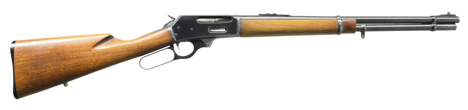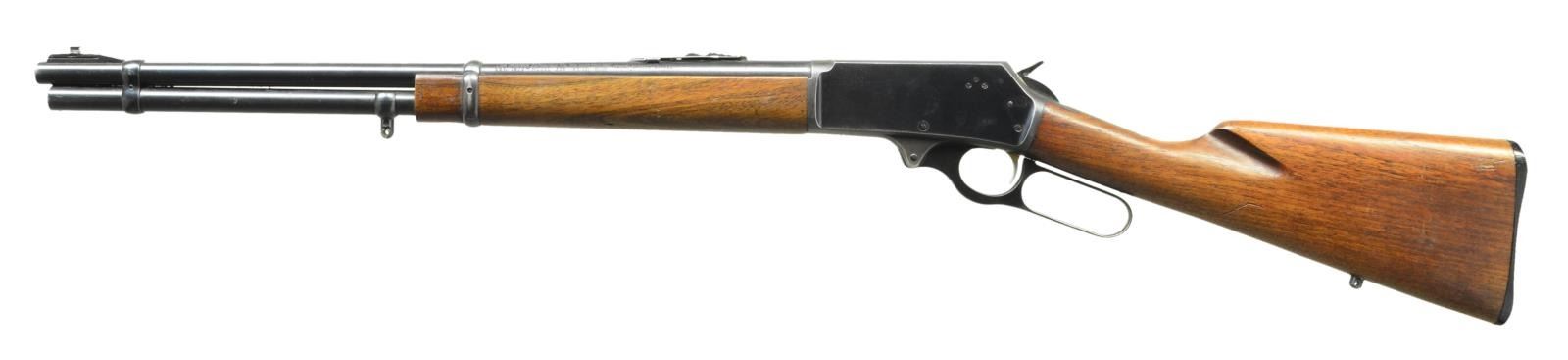 Cal. 30-30. S# T14228. Bbl. 20" w/ Marlin ramp & brass bead front sight plus elevator adjustable rear. Mfg. 1960 (1948-1968) w/ gold trigger plus straight gripped uncheckered walnut stock set having Uncle Mike's sling studs added to mag. tube & at bullseye; no white spacer for Marlin logo black plastic buttplate. CONDITION: About very good overall w/ light stock marks, thinning on receiver from cradling & marks on top of receiver from prior scope mounting; no plug screws. Near excellent Micro Groove bore. (22-3260/NW). CURIO. $350-500.