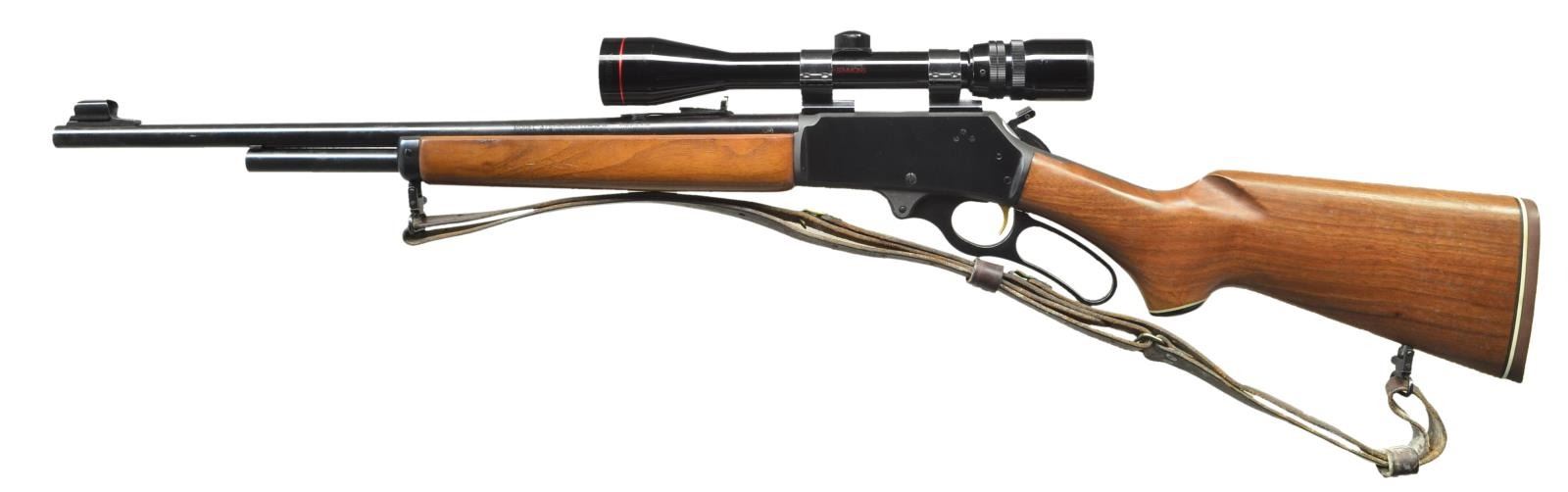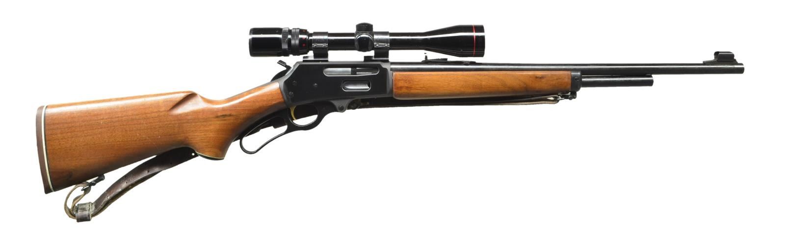 Cal. 375 Win. S# 20066071. Bbl. 20". Hooded ramp front sight. Adj. buckhorn rear sight. Extended hammer. Simmons 3-9x scope w/ Weaver rings. Variable adjustment knob is stuck & won't move. Duplex crosshair reticle w/ optics having a white tint. Pistol grip stock w/ black grip cap & sling swivels. Bottom of butt has two sling stud holes w/ one filled in. Aftermarket leather sling present that shows staining. Brown Marlin recoil pad. CONDITION: stock set has some light handling marks. Metal retains 95% original blue. Very good plus bore. (22-4097/MJC). MODERN. $400-600.