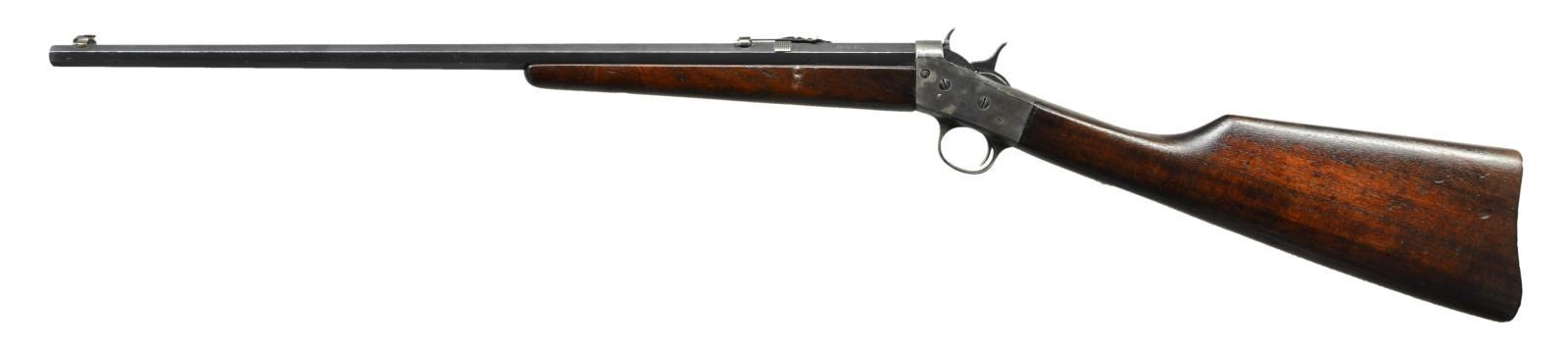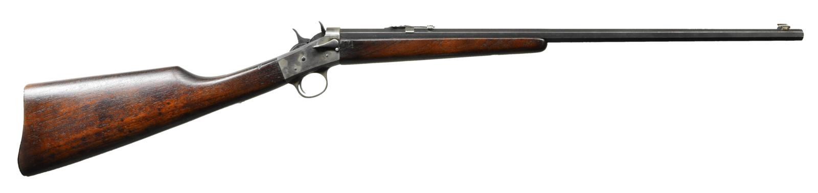 Cal. 25-10 RF. S# J309608. Bbl 22" oct. No. 98 1/2" rear sight. Gold bead front sight. Added screw hole on upper tang. Straight grip walnut stock & forend. Buttplate w/ Remington UMC logo. CONDITION: walnut stock set shows added oil finish w/ some denting around buttstock bottom reinforcement disc, scattered dings & handling marks. The action is turning to gray patina w/ traces of case colors and a few spots of oxidation. Balance of metal retains 80% original blue w/ some high wear & scattered light oxidation. Very good bore w/ a touch of frosting. (22-2805/MJC). CURIO. $200-300.