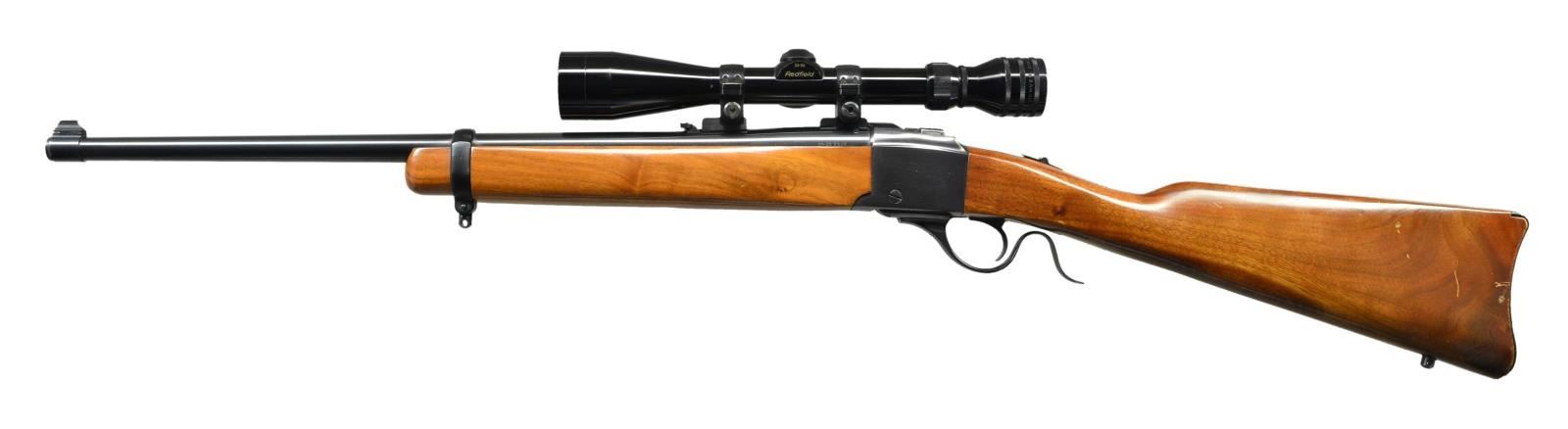 Cal. 30-40 Krag. S# 130-53039. Bbl. 22" w/ band style sight base having bead front sight plus corresponding folding leaf rear. Mfg. 1974 w/out "warning markings" on bbl. Plain straight grip walnut stock set having alloy carbine buttplate & added Uncle Mike's sling studs. Ruger bases & scope rings. Gloss finished Redfield Traditional 3-9 power scope w/ duplex reticle. Very scarce caliber. CONDITION: very close to near excellent metal finish plus similar scope finish. Stock set w/ numerous light marks on buttstock; forend near excellent. Near excellent bore & optics. (22-3248/NW). MODERN. $750-1,000.