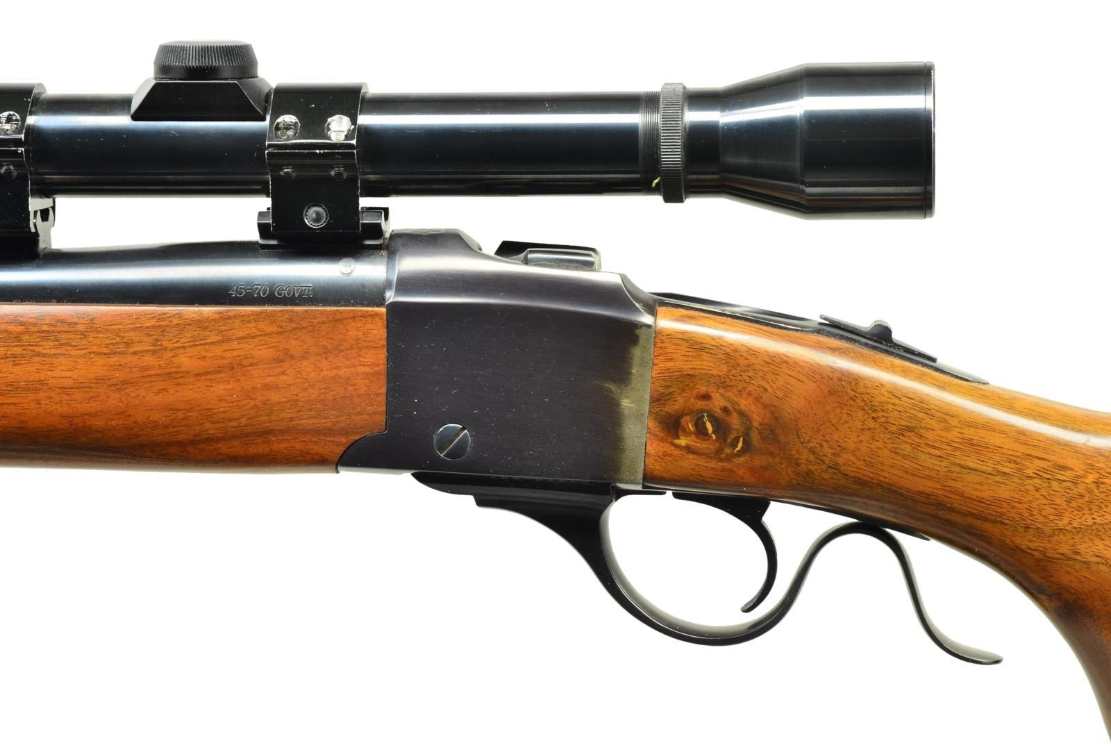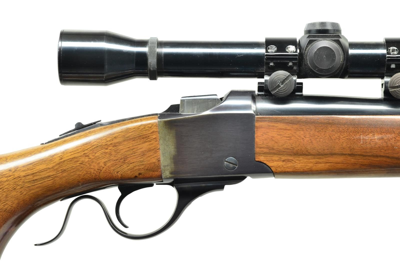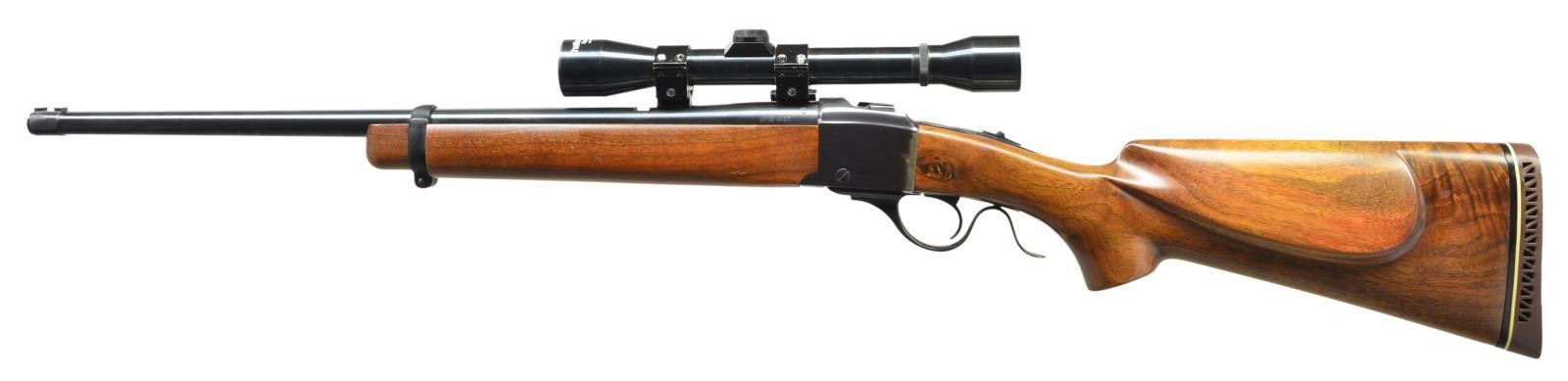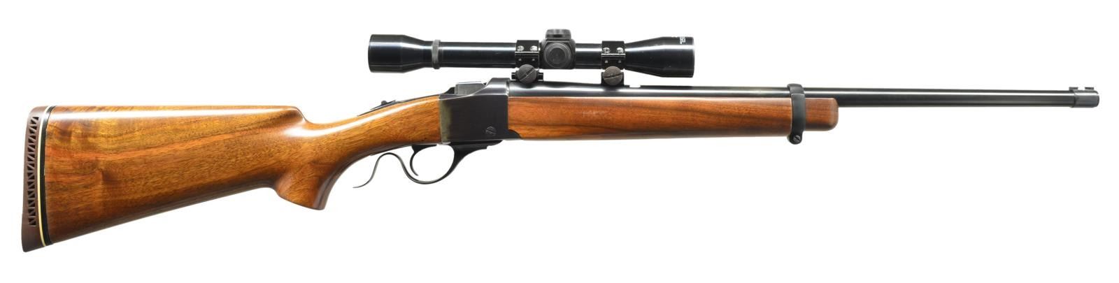 Cal. 45-70. S# 132-24246. Bbl. 22" w/ dovetail provisions for missing front & rear sights. Mfg. 1981. Standard carbine forend; replacement uncheckered buttstock having shadow line cheekpiece, pistol grip & Pachmayr ventilated pad (14 1/4" LOP). Weaver Challenger 4X duplex reticle scope in aluminum rings on Weaver bases. CONDITION: very good appearance w/ tangs slightly proud of wood. Rear of receiver cleaned of prior oxidation & touch up blued; likely caused by factory "salt wood" buttstock. Balance of metal & wood finish very good to near excellent. Near excellent bore & scope set (screwdriver marks on rings). (21-4301/NW). MODERN. $500-750.