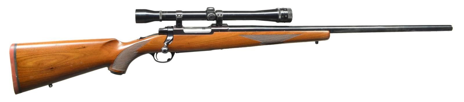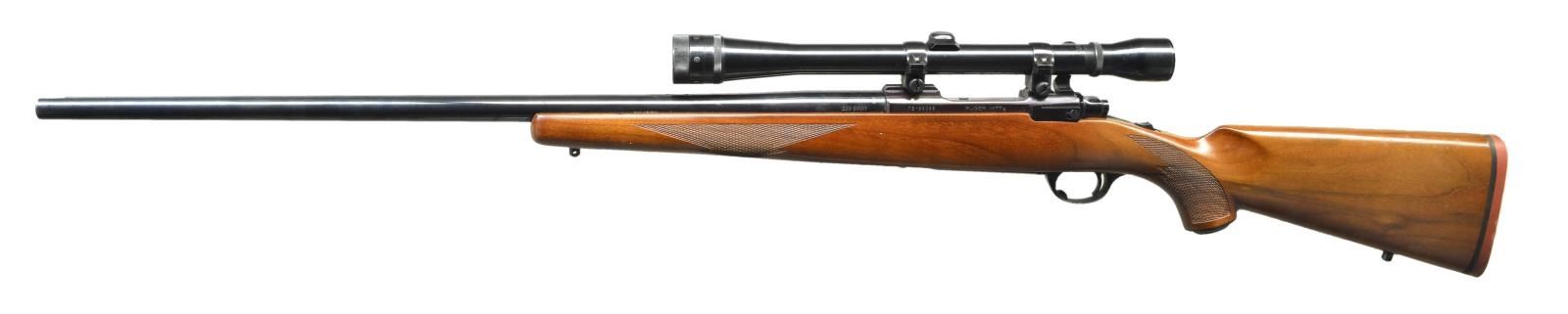 Cal. 220 Swift. S #72-89398. Bbl 26" heavy profile. 1977 mfg. No warning label present. Two vacant holes present on bbl. Weaver K10 scope mounted w/ Ruger rings. Fine crosshair reticle w/ slightly cloudy optics. Checkered walnut stock w/ sling studs, Ruger grip cap & red Ruger recoil pad. CONDITION: checkered pistol grip stock shows some light staining, a couple dings in checkering & a few handling marks. Metal retains 95% original blue. Very good plus bore. (22-4048/MJC). MODERN. $500-800.