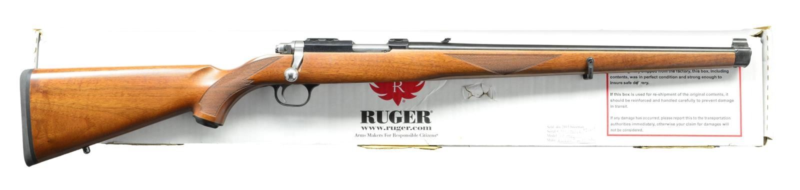 Cal. 22 Mag. S# 703-78212. Bbl. 18 1/2" w/ brass bead front sight & folding leaf rear. Mfg. 2014 as blued Model 07040 w/ desirable satin finished checkered walnut mannlicher stock having sling swivels & black rubber pad. MAGS: 1 factory 9 rd. UNATTACHED ACCESSORIES: original box (light damage) & packaging to include scope rings. CONDITION: all aspects near excellent appearing new. (22-2676/NW). MODERN. $700-1,000.