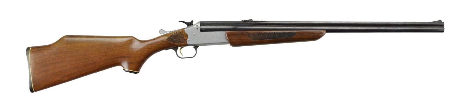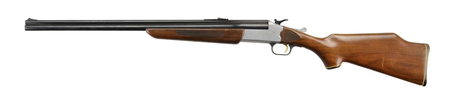 Cal. 22 LR / 410, 3". NSN. Blued 24" bbls. w/ sporting sights. Full choke. Satin chrome receiver having roll engraved woodland scenes w/ fox on left & patridge on right. Gold trigger. Bbl. selector on hammer. Extractors. Pressed checkered walnut forearm & Monte Carlo pistol grip stock. CONDITION: Good lightly faded blue w/ handling marks & pinprick oxidation near breech. Good wood finish w/ moderate handling marks. Very good satin finish. Very good bores. (22-2695/MD). CURIO. $500-700.
