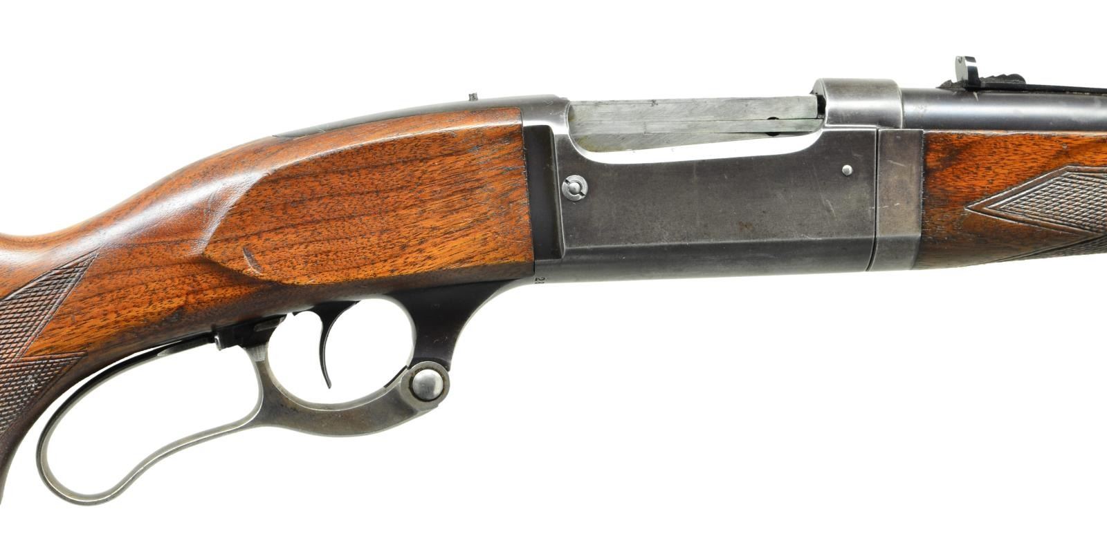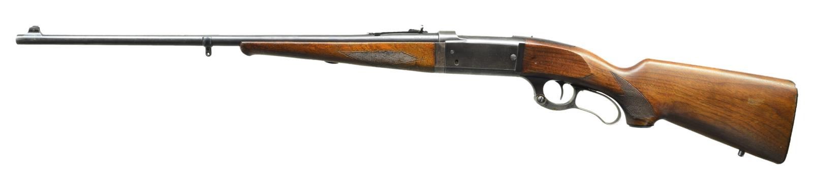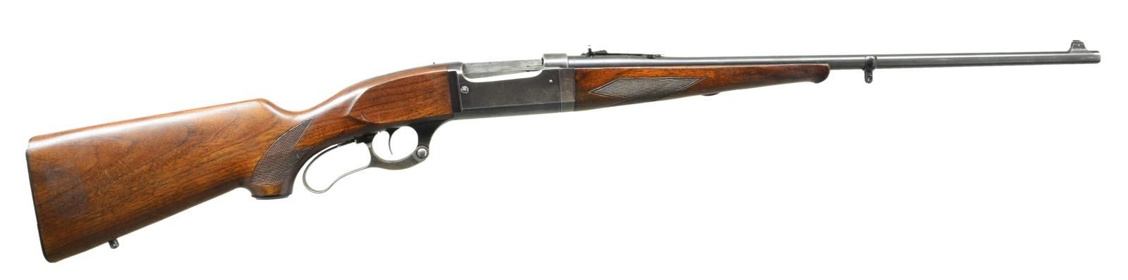 Cal. 300 Sav. S# 288510. Bbl. 24" w/ full square cut threads, white bead blade in integral base plus elevator adjustable semi-buckhorn rear sight. Mfg. 1926 (1922-1941) w/ "M" on lever boss. All normal 99 features to include: serrated steel buttplate, checkered hard rubber grip cap, takedown schnable forend, brass rotor, case colored lever, sliding safety in trigger guard, pin cocking indicator, drilled & tapped for tang sight plus not drilled & tapped for scope mounts. Uncle Mike's sling studs added to buttstock & barrel. CONDITION: very good overall appearance w/ light thinning on bottom of receiver, forend iron & at muzzle. Very good case colors w/ minimal fading. Light marks & slight finish loss on stock set. Near excellent bore & tight barrel fitment. (22-3337/NW). CURIO. $700-1,000.
