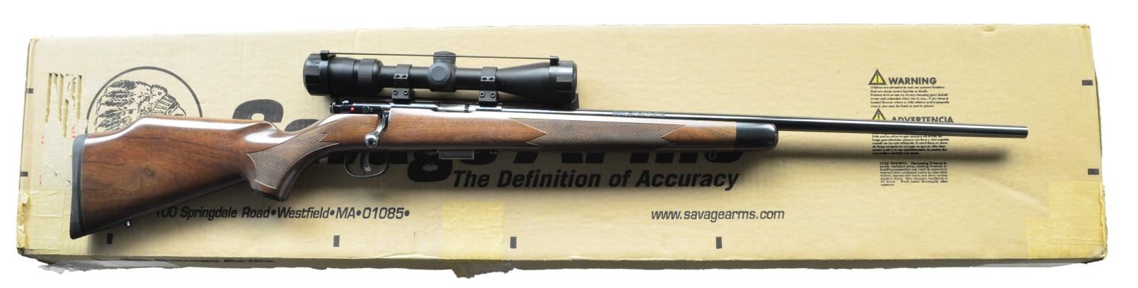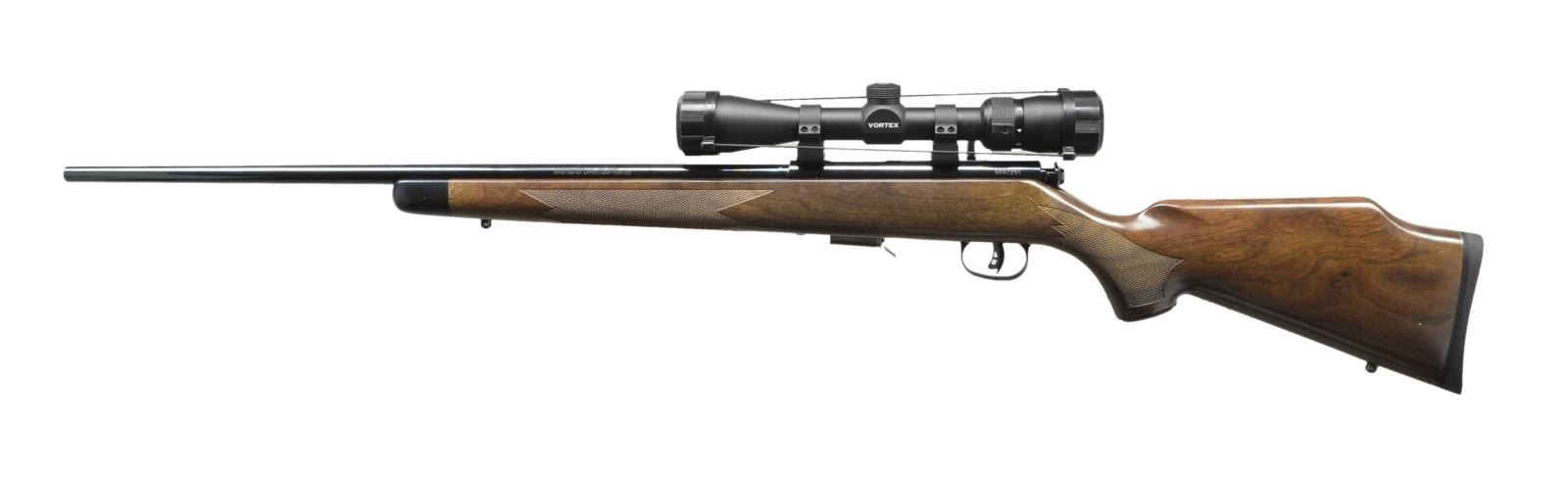 Cal. 22 Mag. (22 WMR). S# G887291. Bbl. 24" w/out sights. Vortex Diamondback 2-7x32 scope w/ duplex reticle on rings & 2 piece bases. High luster blue finish. Walnut checkered pistol grip Monte Carlo stock w/ sling studs, black forearm tip & black recoil pad. UNATTACHED ACCESSORIES: matching numbered box containing scope box, extra mags. & paperwork. CONDITION: near excellent overall including bore. (22-2679/MD). MODERN. $500-700