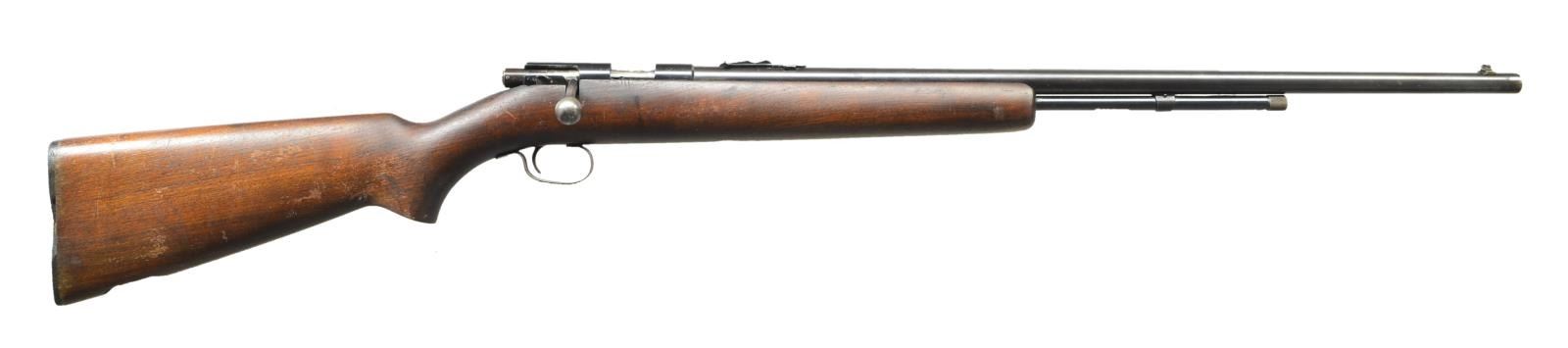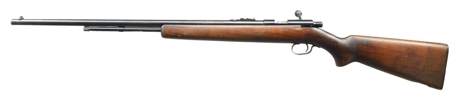 Cal.22 S/L/LR. S# NSN. Mfg.1938-1959. Tube fed bolt action rimfire rifle. Blued finish on exposed metal surfaces. Fixed blade front sight & rear elevation adjustable sight. Hardwood stock. Checkered black plastic butt plate w/ Winchester insignia. CONDITION: Blued finish retains full coverage though blended w/ a very gentle patina sporadically & thinning, primarily on feed tube. Stock possesses several light dents & impressions though no obvious structural damage. Sling swivels were added, then removed at some point. Buttplate is cracked w/ missing piece on right side. Bright bore w/ visible rifling. (22-3942/JZ). CURIO. $200-400.