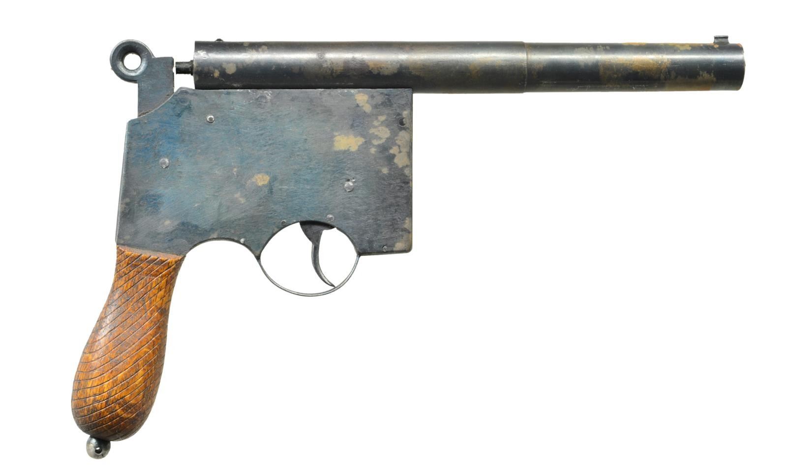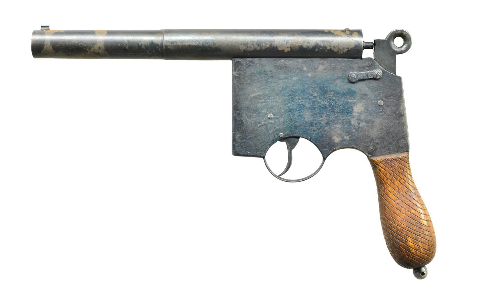 MIMICKING THE SHAPE OF THE FAMED MAUSER BROOMHANDLE. Cal. Appx. 45. NSN. The 8 1/2" 2-step rnd. bbl. has dovetailed through V-notch rear & inset bead front sights. Homemade frame has lever on left side which holds hammer w/ ring shaped spur away from nipple. Function is dbl. action. Walnut broomhandle shaped grip is coarsely checkered & tipped w/ lanyard ring/ball. CONDITION: very fine, retaining most of its original temper blue. There are patches of rust on bbl. Wood w/ most of its oil finish. Bore pitted. Mechanically good. (01-21166/MGM). ANTIQUE. $300-400.