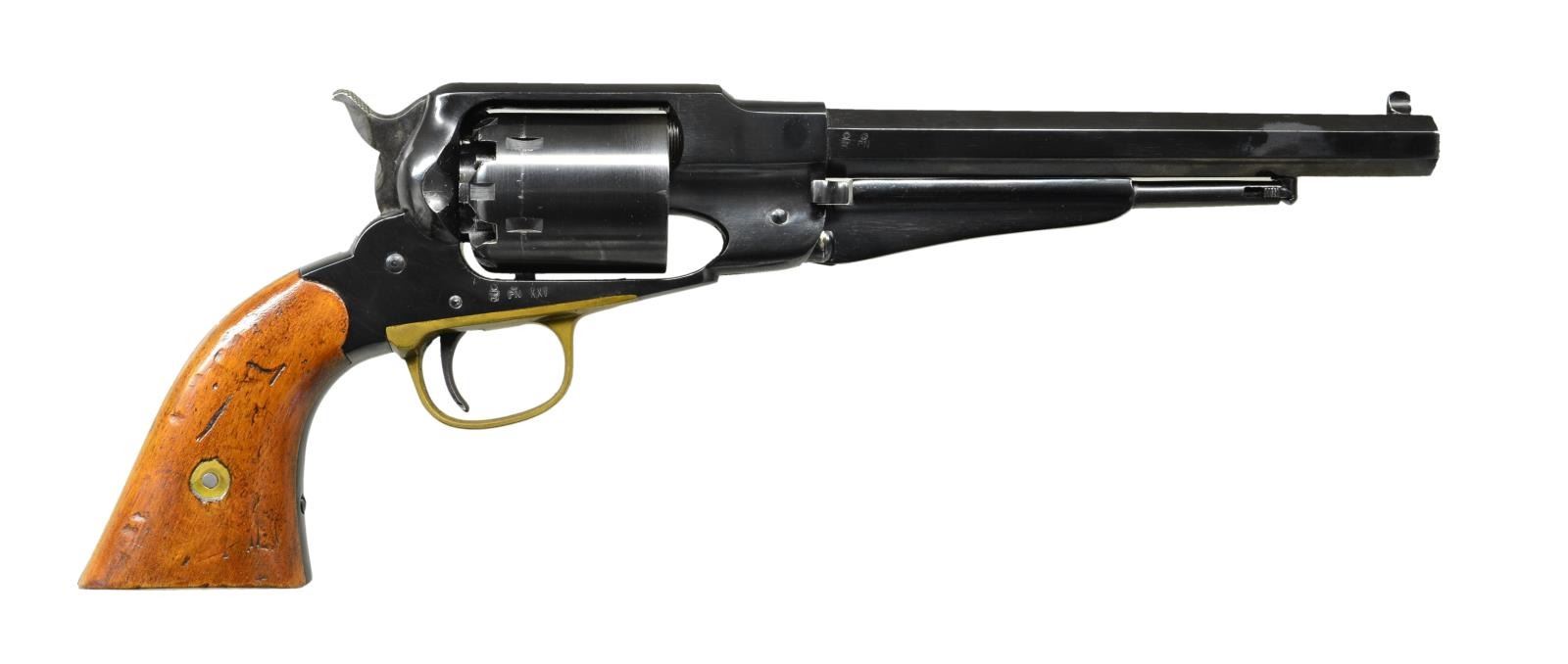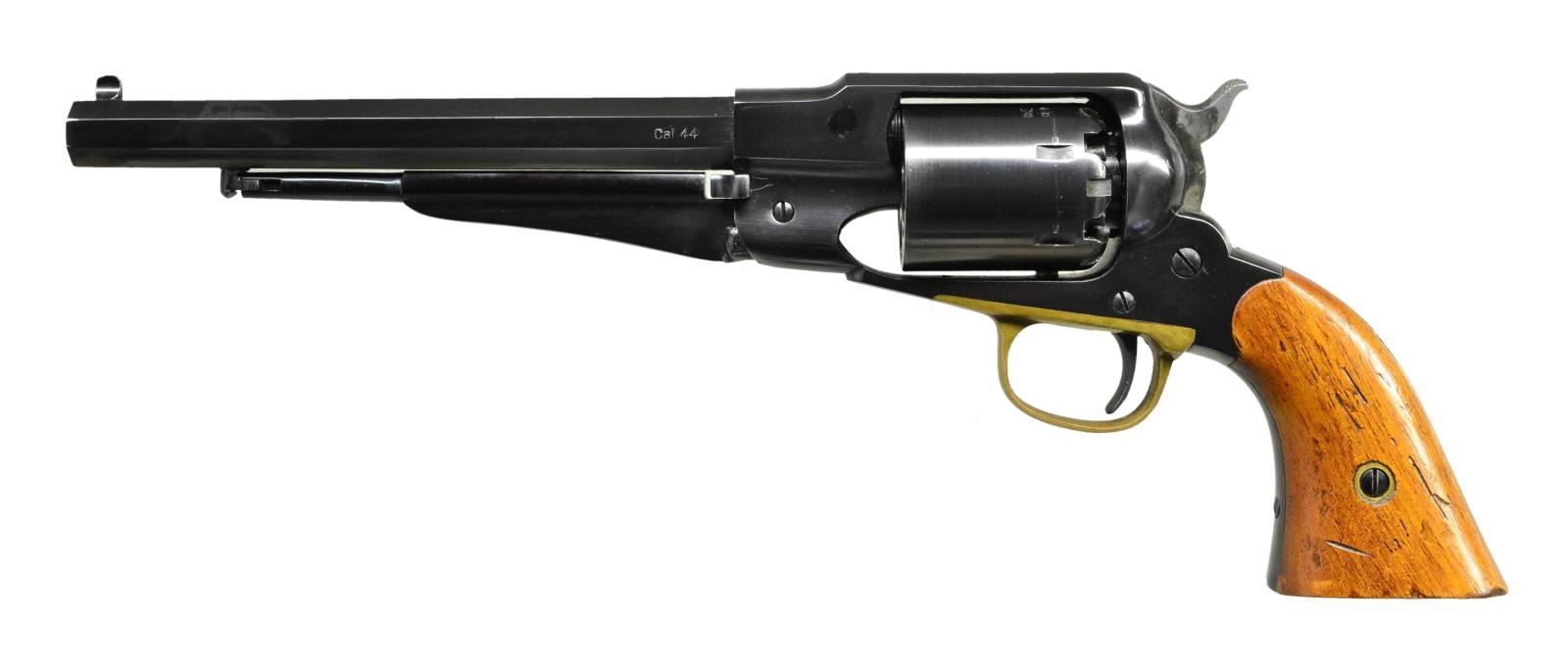 Cal. 44. S #9856. Bbl. 8" oct. Italian made reproduction of an 1858 Remington New Model revolver. Blued frame, bbl. & cyl. Case colored hammer & trigger. Brass trigger guard. Serial number has added white highlight. European walnut grips. CONDITION: grips have added varnish w/ a couple light chips, scattered scratches & handling marks. Blued surfaces retain 95% finish w/ a drag line on cyl. & some handling wear. Hammer & trigger are a gray patina w/ some oxidation staining. Trigger guard is a dull yellow patina w/ tarnish. Very good bore. (01-21339/MJC). ANTIQUE. $200-400.