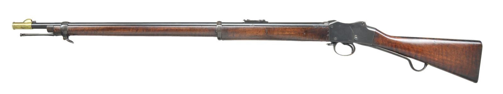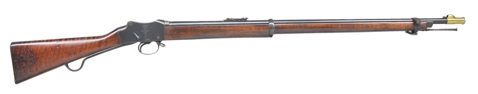 Cal. 577/450. S #558. Bbl. 33". Top rear of Bbl. marked w/ an "F" and cross symbol. Rear of bbl. also has British proofs on both sides at rear. Left side of Bbl. marked "NS NEP" for Nepal Native Service to left of rear sight. Right side of receiver is marked w/ British crown, "V.R.", "ENFIELD", 1887, "IV", "1" & w/ an upside down "3". This rifle is a conversion from an earlier short lever Martini rifle. Rear sight graduated to 1300 yards. Front blade sight. Bands have British proofs. Walnut stock set. 1906 date, British ordnance roundel & Nepalese markings on right side of butt. Markings look enhanced. Ramrod present. UNATTACHED ACCESSORIES: brass muzzle cover marked w/ British proofs & lined-out 658. CONDITION: refinished stock set w/ a couple patch repairs in ramrod channel, a couple filler repairs, some dings & handling marks. Metal shows a mix of arsenal rework and touch blue w/ a few areas of light pitting, light oxidation & handling marks. Very good bore. (01-21071/MJC). ANTIQUE. $300-500.