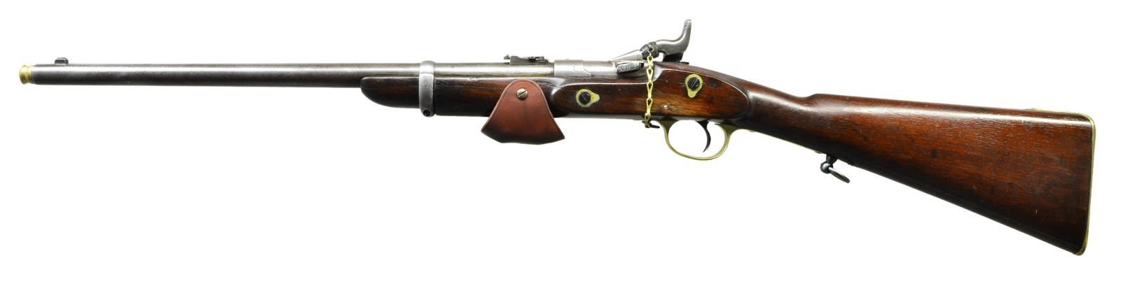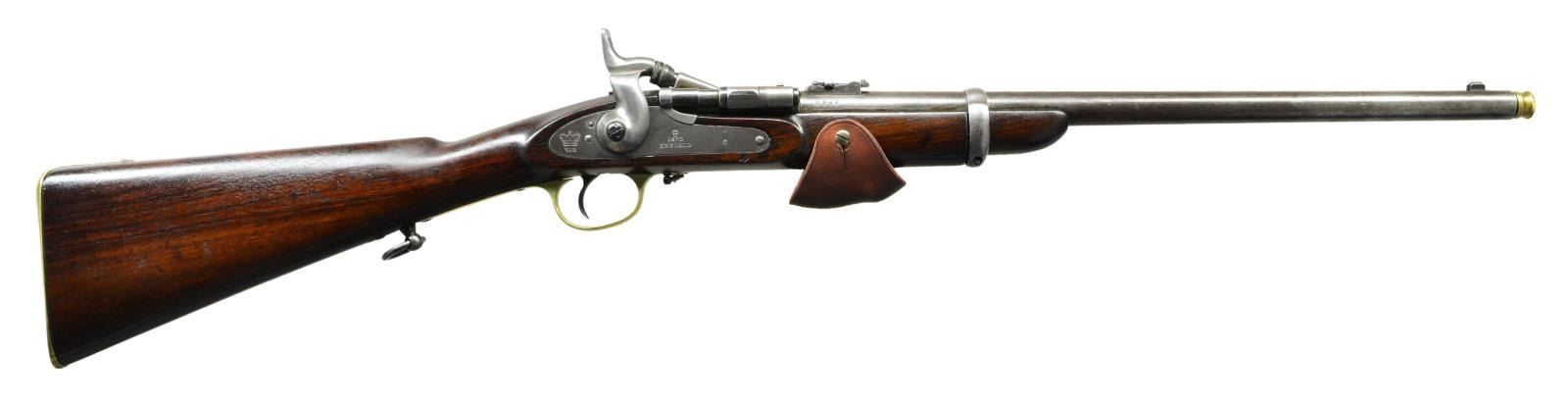 Cal. 577 Snider. NSN. Bbl. 19". Top of receiver marked "III". Right side of Bbl. marked "A896". Left side of Bbl. & receiver marked w/ British proofs. Lockplate marked "Crown/1870/ENFIELD" and w/ "CROWN/VR" behind hammer. Top of buttplate is marked "R9/A/32". Ladder rear sight graduated to 600yds. Blade front sight. Walnut stock. Lower tang w/ saddle ring. UNATTACHED ACCESSORIES: Reproduction leather rear sight cover and brass muzzle cork. CONDITION: refinished stock w/ added varnish, left side shows repaired 8" crack running from nose to behind front recoil bolt, a few smaller cracks, scattered dings & handling marks. Brass parts were cleaned and show some dings & old oxidation staining. Balance of metal is a gray patina w/ a couple areas of light pitting & scattered oxidation staining. Good bore w/ scattered light pitting. (01-21076/MJC). ANTIQUE. $300-400.