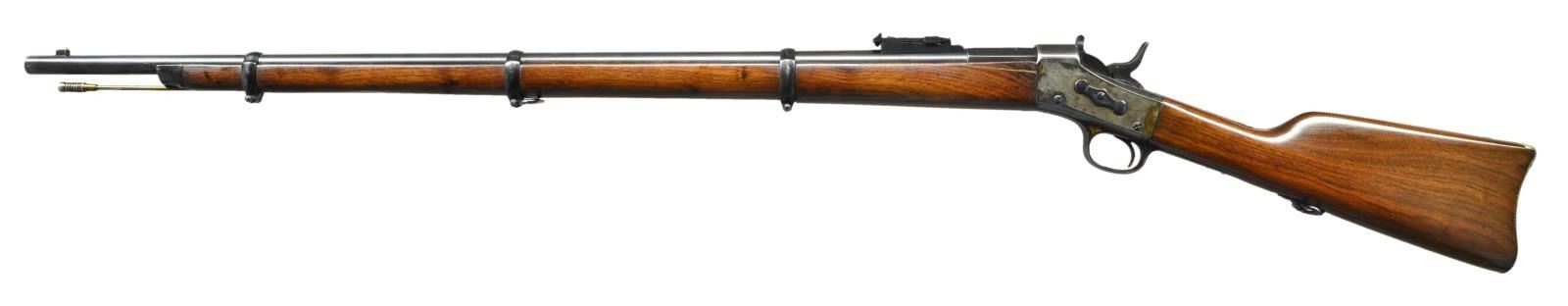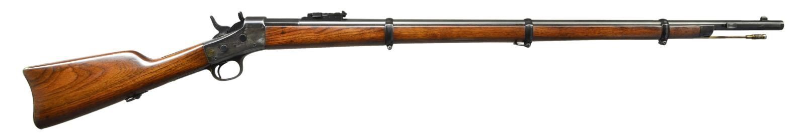 Cal. 43 Spanish. NSN. Bbl. 36". Tang has E. Remington & Sons markings w/ last patent date of March 18th 1874. No Bbl. markings visible, likely removed during arsenal rework. Argentine ladder rear sight graduated to 1300 meters. Inverted V front sight. Bbl. has saber bayonet lug. Slotted ramrod is present. Bottom mounted sling swivels. Hardwood stock set. CONDITION: refinished stock set has a glue repaired 3" crack at left rear of forend and scattered handling wear. Action is turning to a smoky gray patina w/ scattered traces of arsenal rework blue. Balance of metal retains 90% arsenal rework blue w/ some blued over pitting on woodline & some light fading. Near excellent bore. (01-21363/MJC). ANTIQUE. $300-400.