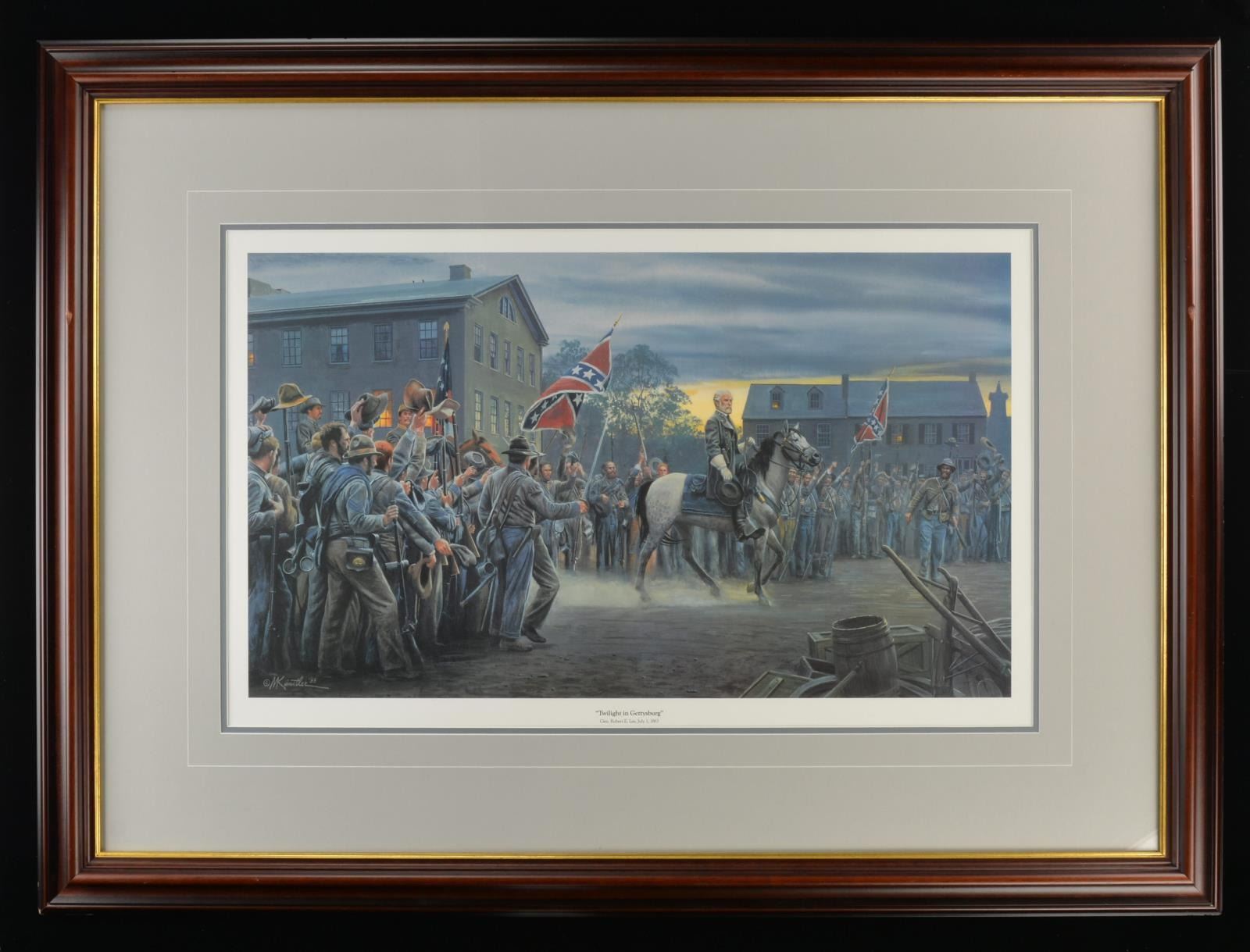 GETTYSBURG, JULY 1, 1863” PROFESSIONALLY FRAMED L.E. PRINT. 32” x 45” framed, 1993. Signed & numbered l.e. print 77/1500. CONDITION: fine overall. PROVENANCE: The Cullen Smith Estate Collection. (02-17285/JS). $200-300.