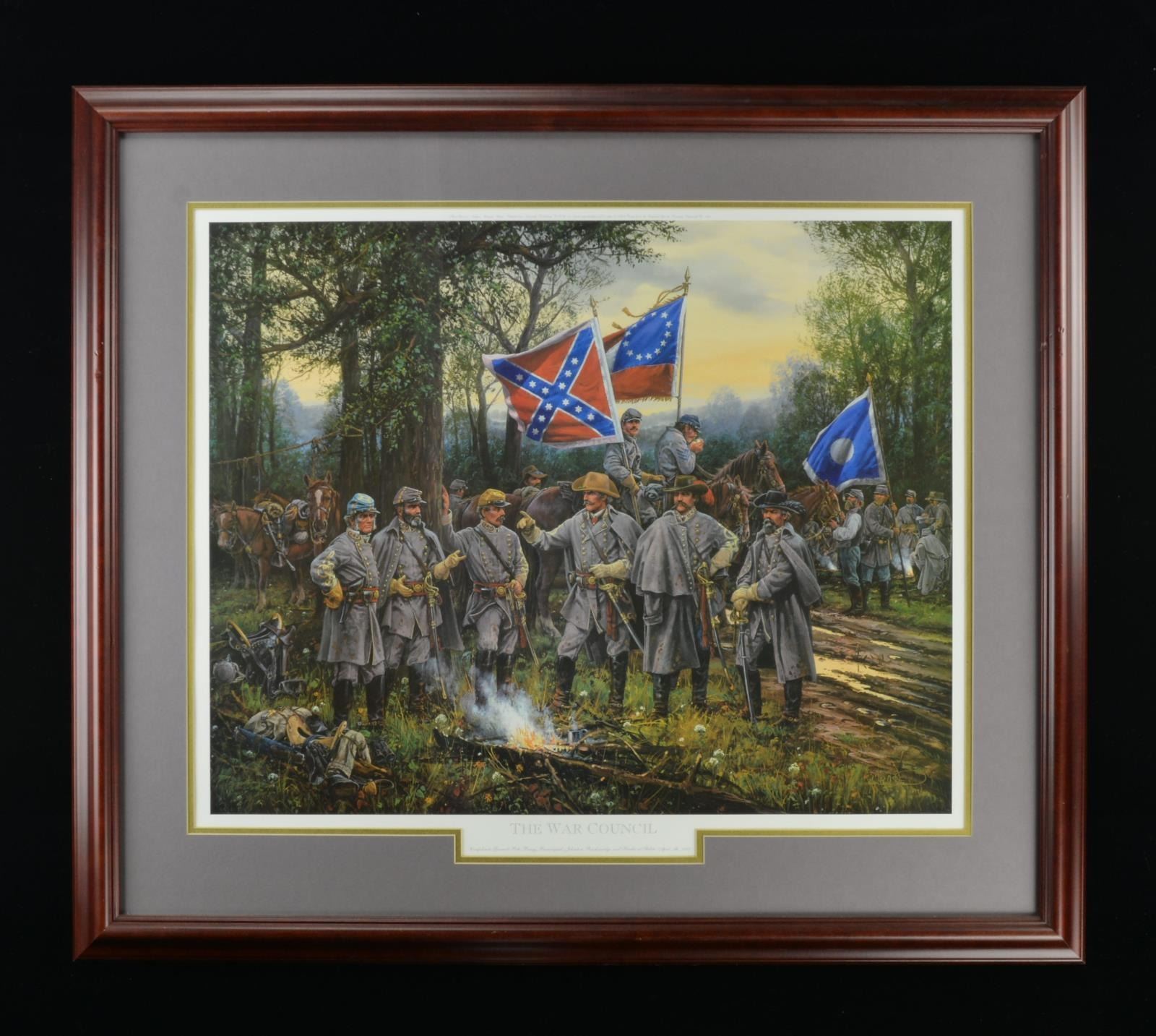 COUNCIL” PROFESSIONALLY FRAMED PRINT. 37” x 33” frame. APRIL 5, 1862 Pittsburg Landing, near Shiloh, Confederate Generals Polk, Bragg, Beauregard, Johnston, Breckenridge, & Hardee plan strategy against a massive army commanded by Ulysses S. Grant, signed & numbered limited-edition print 844/950 & COA. CONDITION: fine overall. PROVENANCE: The Cullen Smith Estate Collection. (02-17304/JS). $200-300.