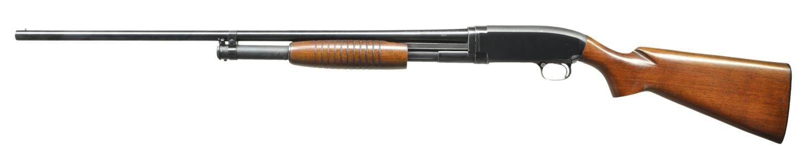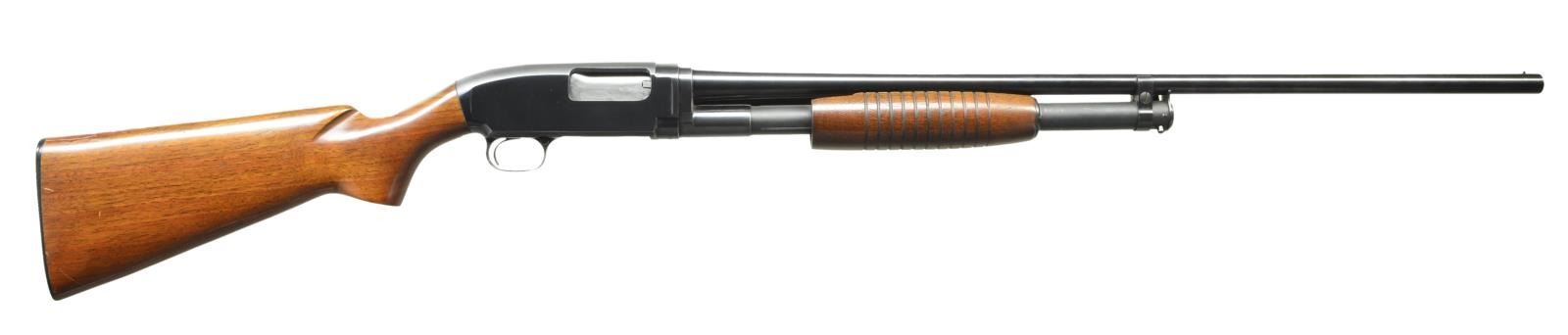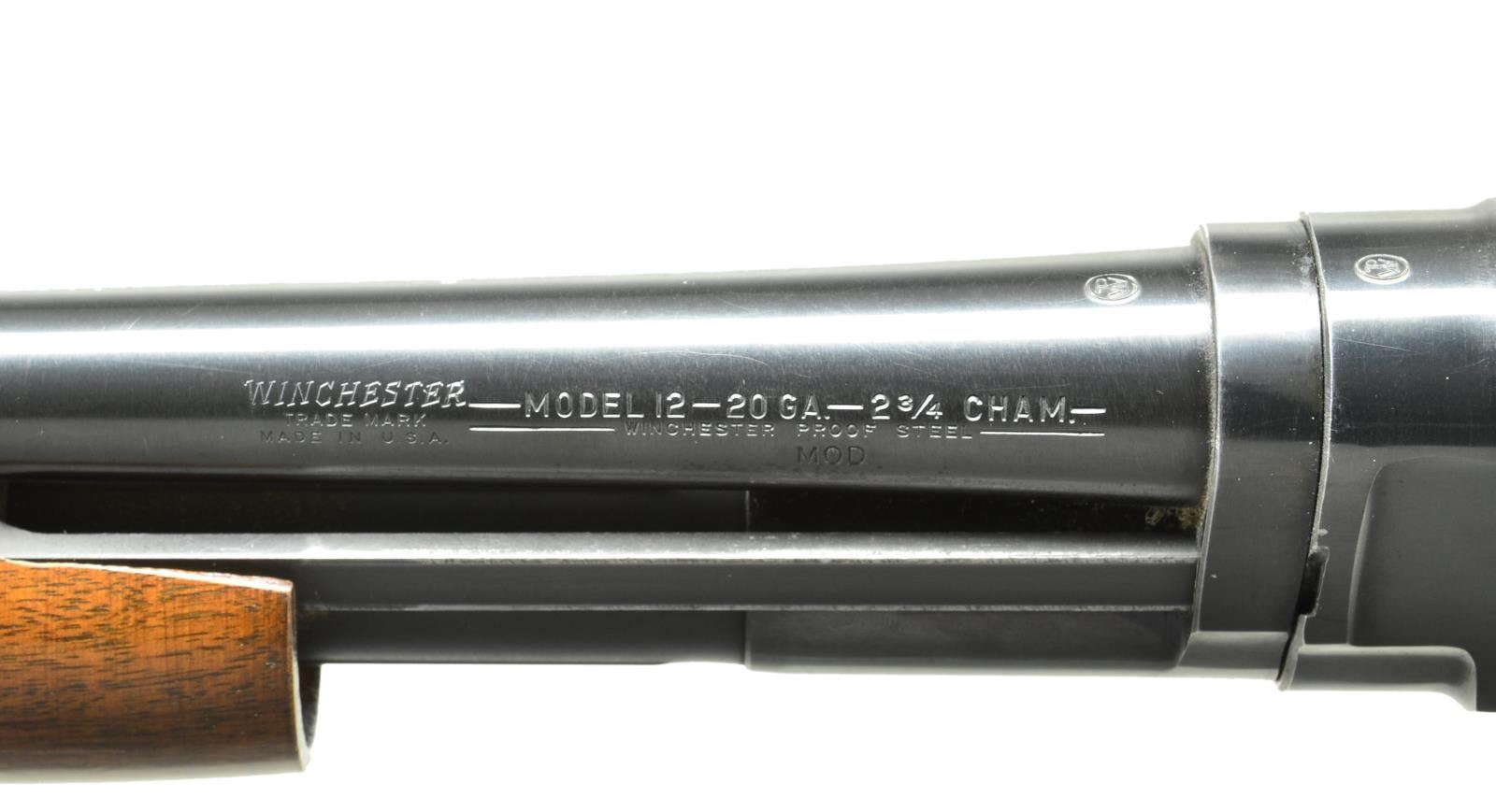 SHOTGUN. Cal. 20 Ga. S# 1939455. Standard configuration & markings w/ plain 28" bbl., choked modifed. American walnut pistol grip stock measures 14 1/8" over Winchester hard rubber buttplate. Late style forend has 11 grooves. CONDITION: very fine, metal parts retaining about 95% original blue w/ some sharp edge wear & some scattered marks & rubs. Stocks retain nearly all of their original finish w/ some scratches & marks, mostly noted on right side of buttstock. Bore is bright & shiny. Mechanically fine. (22-2832/MGM). CURIO. $700-1,000.