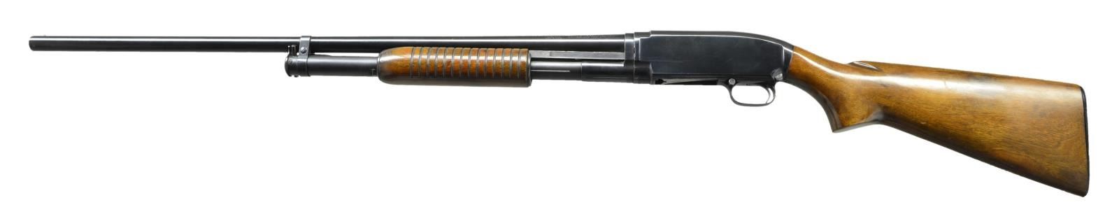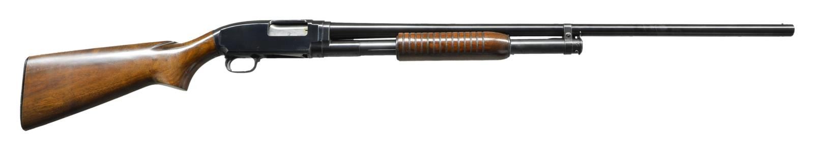 Cal. 12 Ga., 2 3/4". S# 1507046 (1955). Bbl. 30" w/ bright bead & Full choke. Walnut grooved forearm & pistol grip stock w/ replacement hard rubber buttplate. CONDITION: Very good blue. Very good wood finish. Fair buttplate w/ 1 missing screw. Very good shiny bore. (22-2726/MD). CURIO. $350-500.