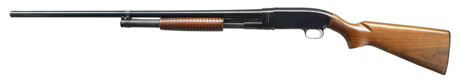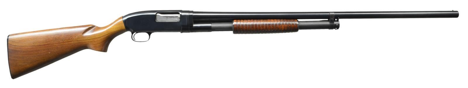 Cal. 12 ga., 2 3/4". S# 864577 (1941). Replacement 1950's 30" bbl. w/ bead & full choke. Grooved walnut forearm & pistol grip stock. LOP: 14 1/4" to Win. buttplate. CONDITION: very good blue w/ wear, spots of peppery oxidation & marks. Very good forearm finish. Lightly sanded & refinished buttstock has very good finish. Very good bore. (22-2748/MD). CURIO. $300-450.