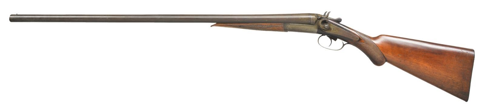 Cal. 12 Ga. S# 38694. Bbls. 30" w/ brass bead & marked on rib "TWIST FINISH BELGIUM". Mod. & Mod. chokes. Back action island hammer locks. Dbl. triggers, rear is broken off. Extractors. Checkered walnut forearm & rnd. knob pistol grip stock w/ grooved metal buttplate. CONDITION: fair faded metal to brown/gray patina w/ marks & white paint spots. Good worn wood finish w/ moderate marks & & sm. chips. Fair bores w/ fouling & pitting near chambers. (22-2517/MD). CURIO. $75-125.